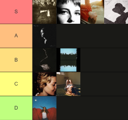 >>129596762No pressure from me. I was just curious to see where you stood.As for me, Surrender gets the obvious S-tier. "Want Want" instantly hooked and inspired me to check out more of her work. Of her exclusive non-album singles, "Love You for a Long Time" and "Split Stones" are her best. Notes from the Archive is a decent compilation although God knows why she chose to include "Kids Like Us" instead of "Creatures" or "A Love Letter". She had the good sense to close out the compilation on "Satellite", though.Blood Ballet is okay, but a bit bare bones for me. Now That the Light Is Fading has "Dog Years" and "Better".Don't Forget Me is a missed opportunity, and "In the Living Room" is her desperate attempt to be Natalie Imbruglia.Heard It in a Past Life simply isn't my style despite great tunes like "Fallingwater", "Light On" and "Retrograde".
