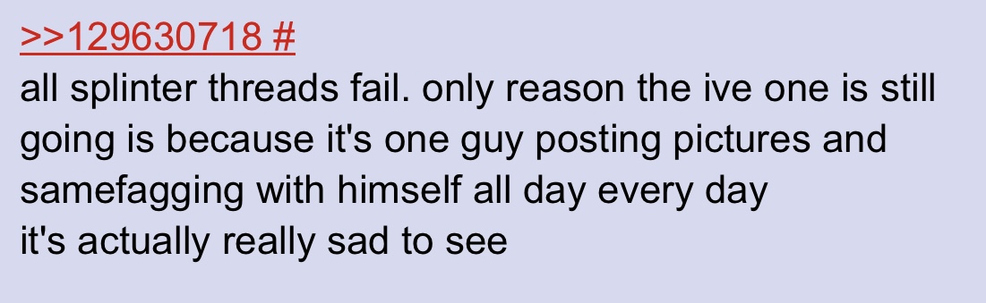>>129633167Yea it's what I thought as well, dude refuses to believe 3 people regularly post here. It was very clear it was just the Winty poster trying his best to keep it alive for other people to post.>>129633630You are right, but a part of me feels like you are saying that just because it's Leeseo.