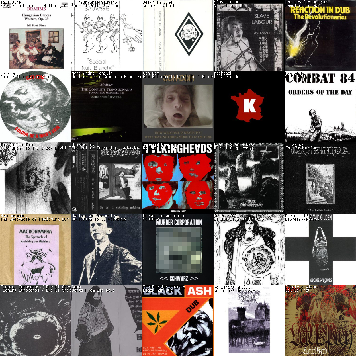 >>129660750>recsgrim - folk musicfistfuck - livecon-dom - all in good faithinterracial sex - alternative eugenicscaligula013 - albanian meat marketatrax morgue - collection in formaldeide the sodality - the orgies of crimecountry club - the pigs unscathedblackhouse - five minutes after I diecontrolled bleeding - distress signalsstrict - kissbrighter death now - may all be dead