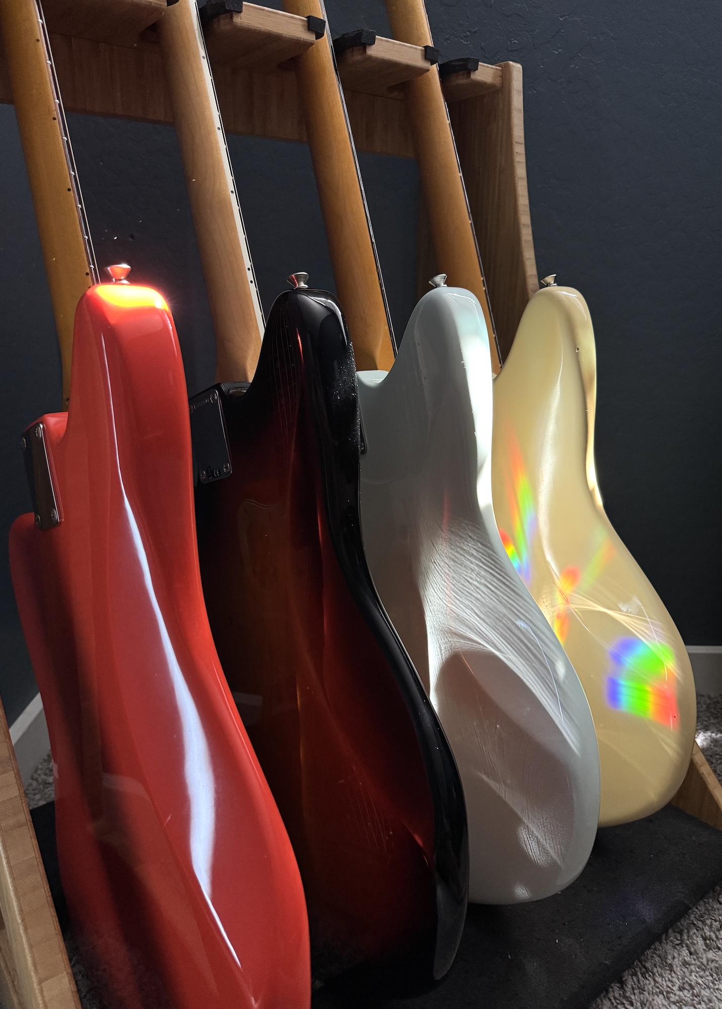 >>129667958Theres pictures as well. Supposedly going with matching headetocks, rosewood fretboards, and clay dot inlays. Probaly just an excuse to make them a little more expensive. >jazzmaster in sonic blue>jaguar in burst and sherwood green>mustang in olympic white>candy apple red bass vi