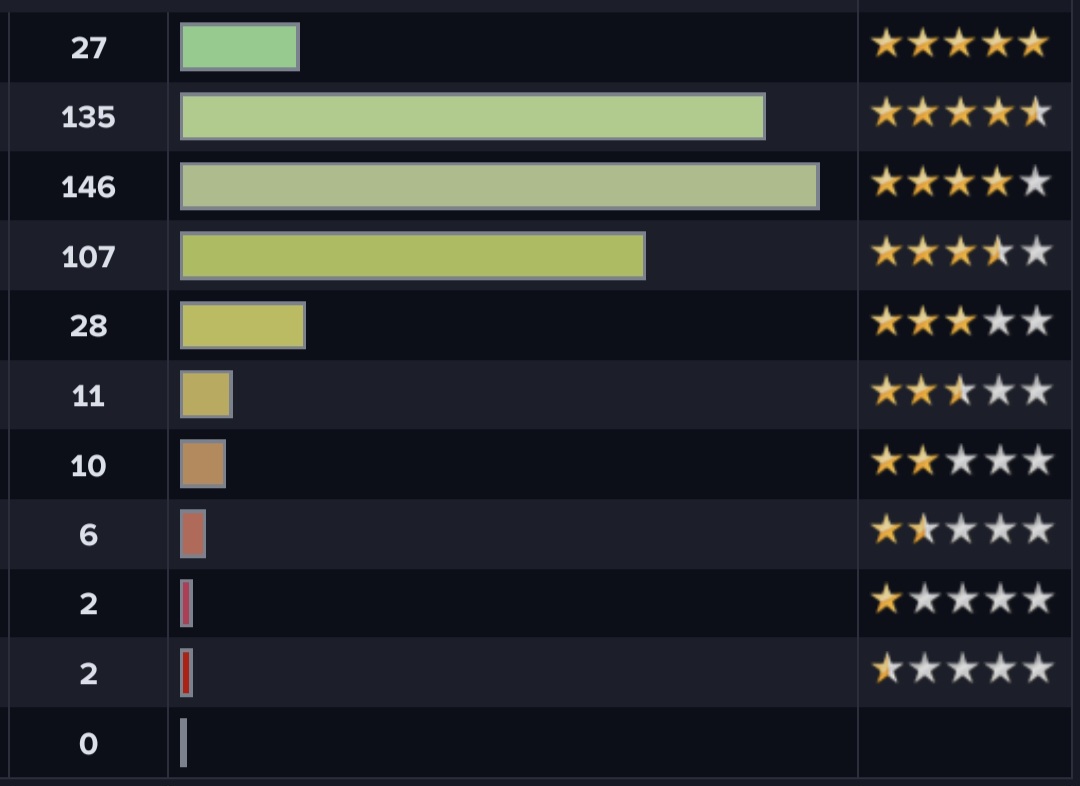 >>129672262distro centering on 4 stars is a lil high but 3.5 stars is reasonable if you don't spend time reviewing mediocre crap (you shouldn't)