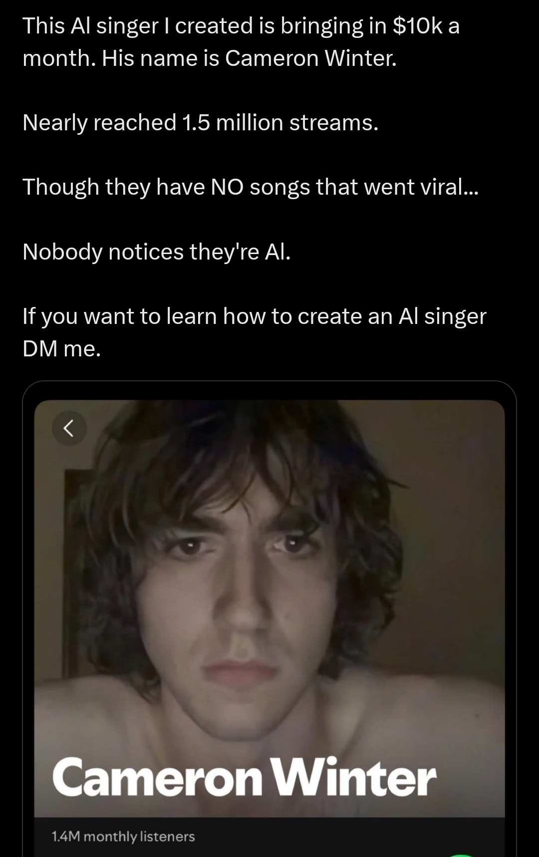 >>129672479How much money do you need to put into it in order to generate that much though? I'm guessing there are a lot of costs associated, paying subscription fees for AI services, marketing, etc. And that's no guarantee that your particular fake AI singer will beat out the others, I'm sure there are a lot of people doing this, and the more people do it, the more competition there will be and the less people will be able to make off of it. Ultimately if you're interested in making passive income, I don't see why this is better than stocks or crypto.
