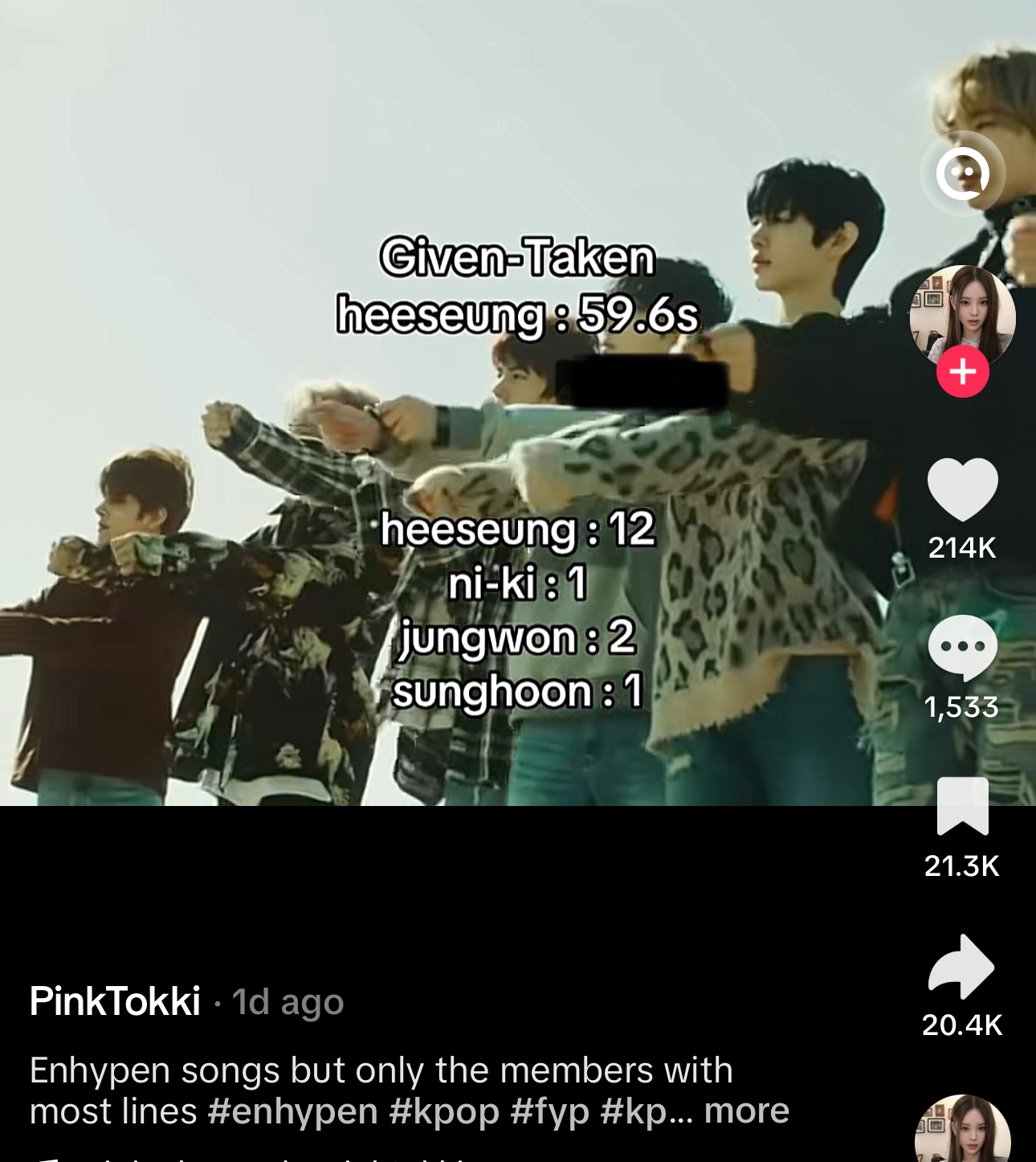 >how many lines does Heeseung have?>i check>he has a minute worth of lines in most the songsEnhypen is cooked