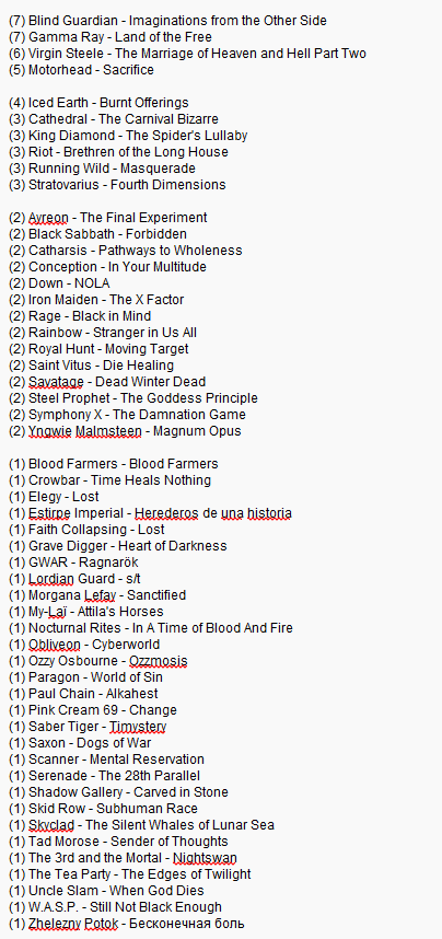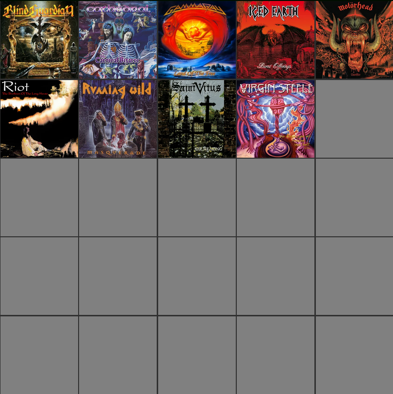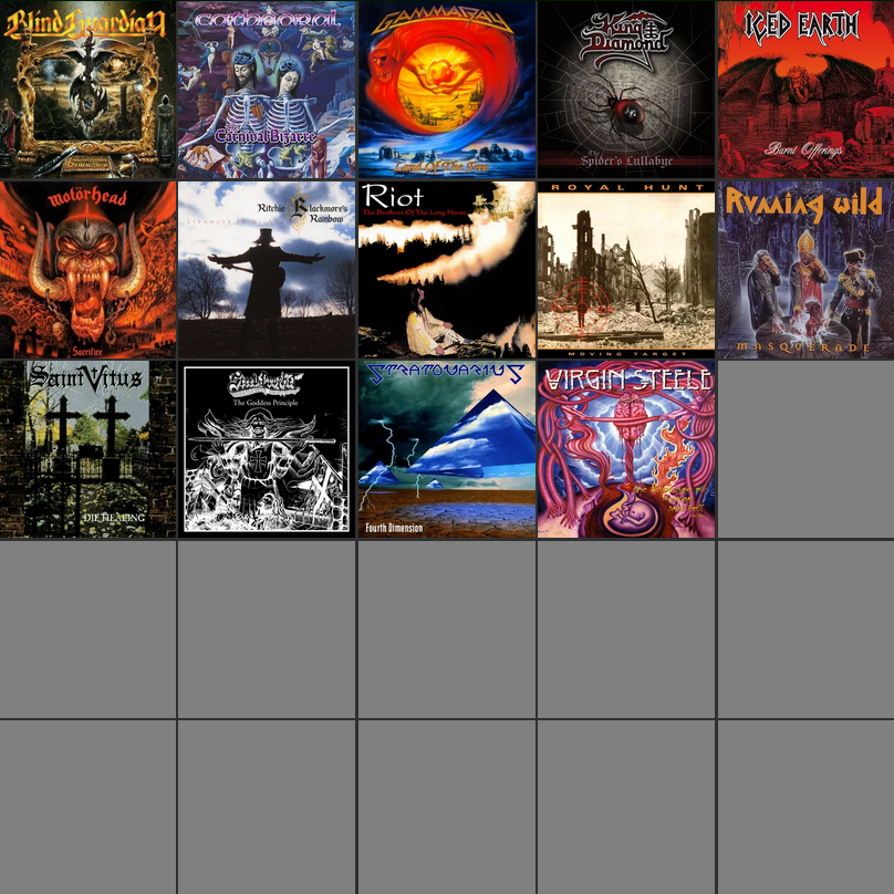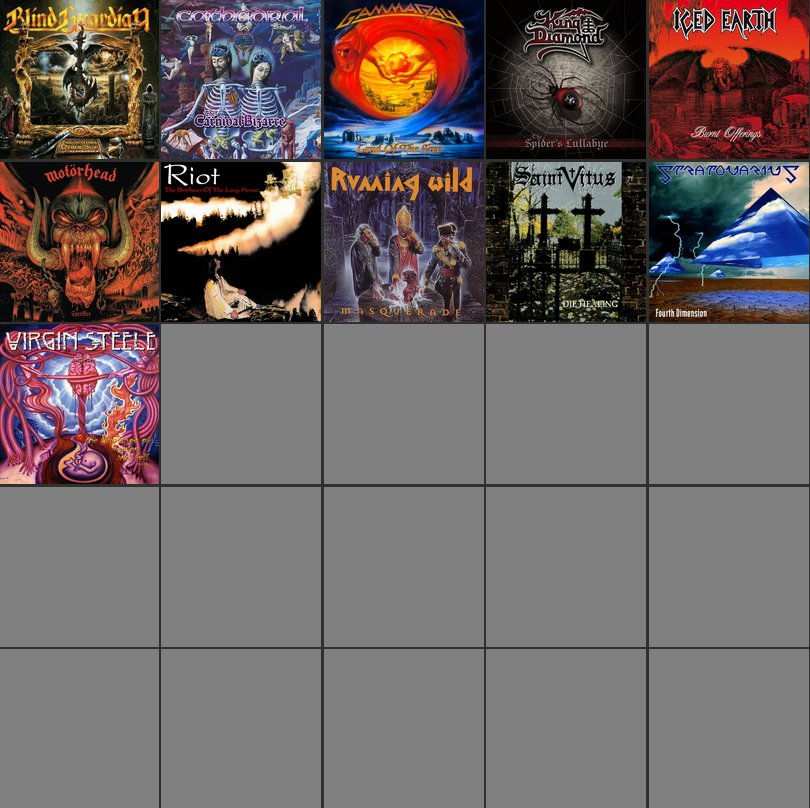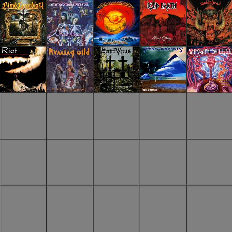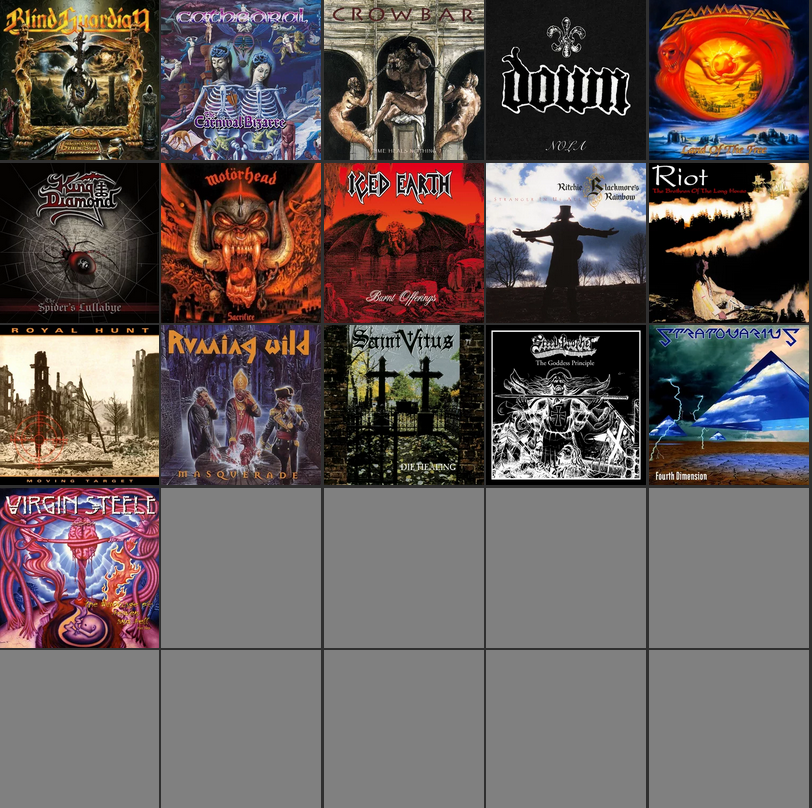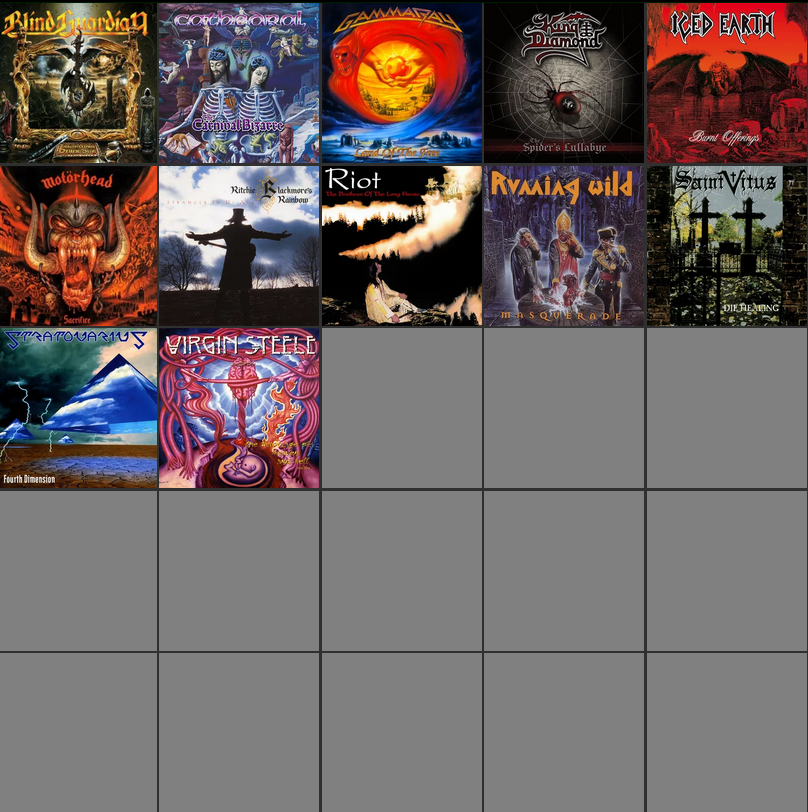 >>129684786Blind Guardian - Imaginations From the Other SideConception - In Your MultitudeGamma Ray - Land of the FreeIced Earth - Burnt OfferingsKing Diamond - The Spider’s LullabyeRage - Black in Mind