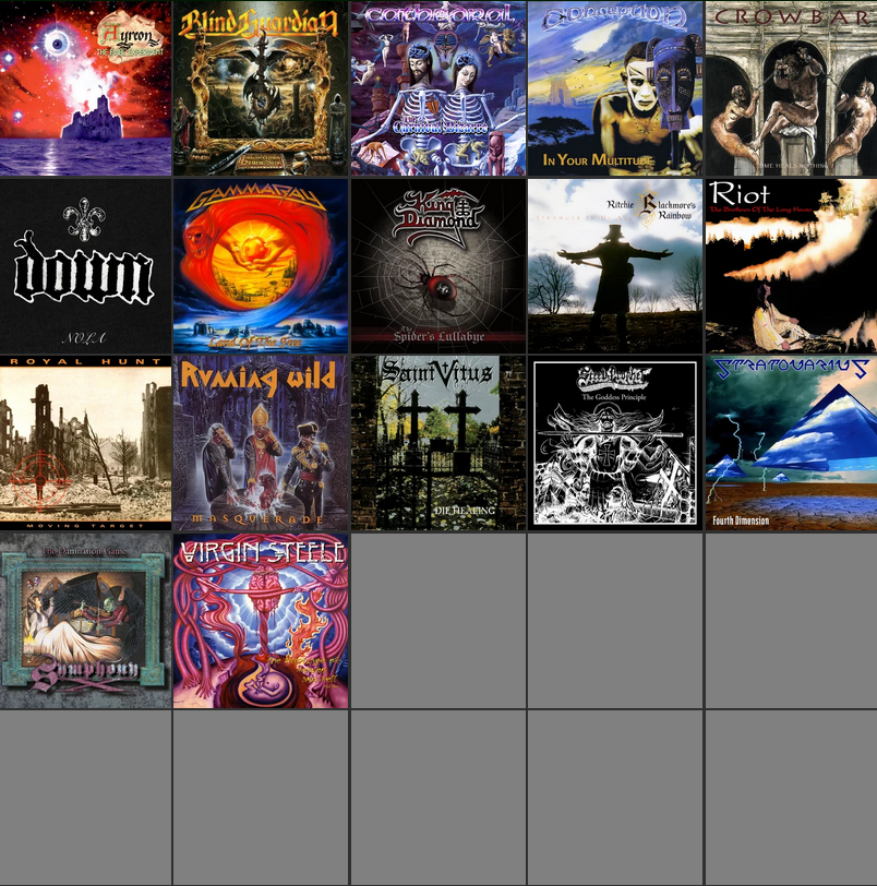 >>129684786Blind Guardian - Imaginations from the Other SideGamma Ray - Land of the FreeRoyal Hunt - Moving TargetSteel Prophet - The Goddess PrincipleStratovarius - Fourth DimensionVirgin Steele - The Marriage of Heaven and Hell: Part 2
