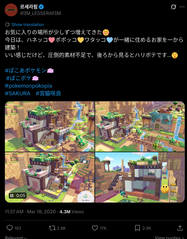 >>129721752sakura is playing the new pokopia and it's getting mega traction on the timelineim thinking this game will be the stardew valley replacement