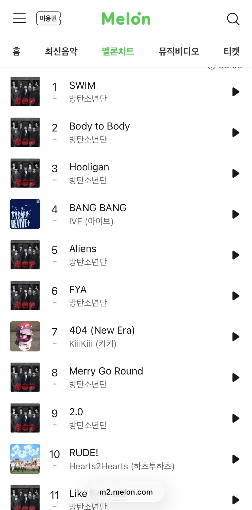 Biggest debuts by K-pop acts on the Global Spotify Chart history:1. #JUNGKOOK, Seven (feat. Latto) — 15,995,378 streams2. #BTS, SWIM — 14,644,352 streams 3. #BTS, Body to Body — 11,185,035 streams 4. #BTS, Butter — 11,042,335 streams5. #BTS, Hooligan — 8,735,463 streams