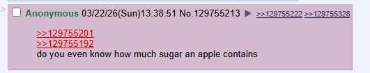 >>129755314an average apple contains 15-20 grams of sugar. the recommended daily limit of sugar for adults is 30 grams of sugar, much lower for children. eating more than one apple per day negates other health benefits that come from consuming apples.i shouldn't be surprised but kpg really isn't home to many functional people