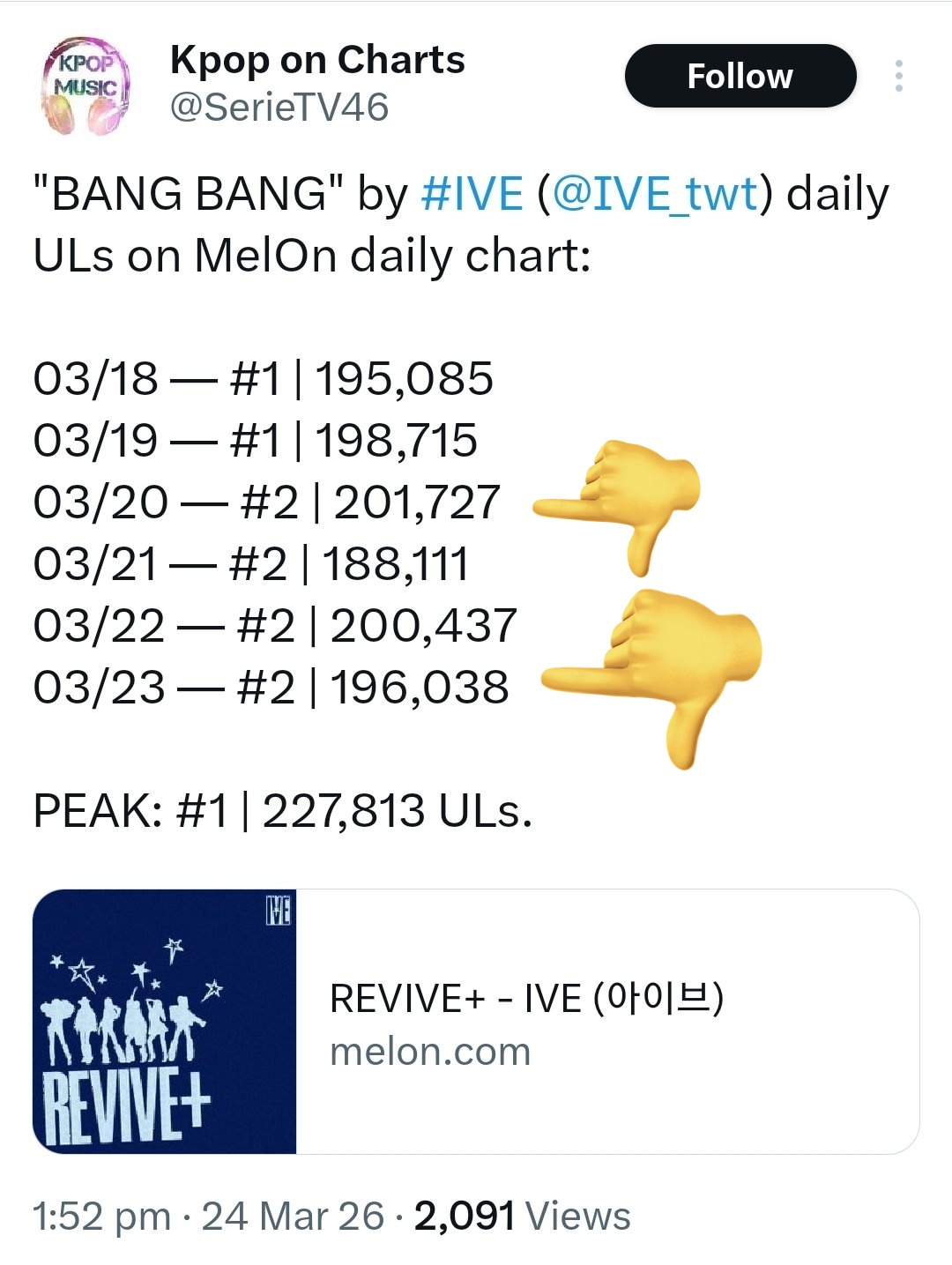 >>129789895IVE also overtook BTS paks by literally 1.