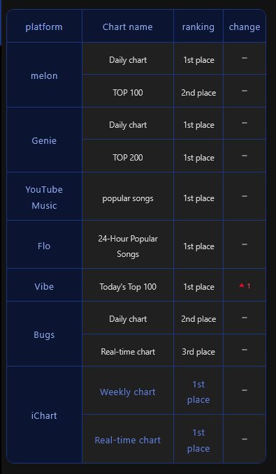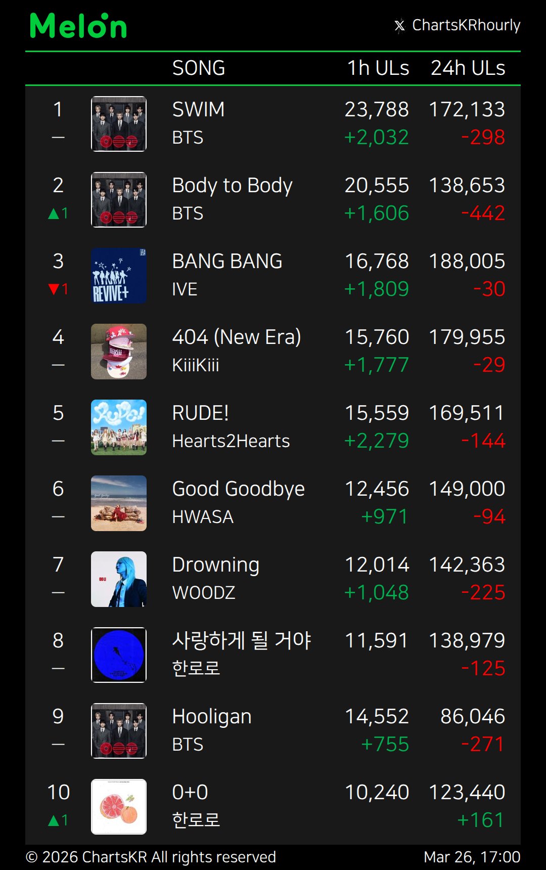 >>129789895bts will get a bump on sunday because of youtube. if not for that ive could have realistically done something very funny while bts is promoting. I'm expecting even stronger push from hybe and international fans to discredit korean charts.>>129791591they kept going and have 27 more than bts now>>129791963like anon posted melon uls haven't increased for ive. but also: ive, kiiikiii, and h2h are separately ahead of bts on bugs all day. there's no coordination. it's just bts flopping with the gp and k-army not being able to compensate (>>129792173 >>129792202). gp are listening to bang bang and other songs more throughout the day on melon while k-army are only boosting bts on hourly when they can, but this doesn't work to win the melon daily unless the hourly gap is massive. there are hours when multiple songs are being played by more uls than any bts song, just like on bugs. basically one fandom can't brute force melon daily #1 if the gp is streaming something else organically. it's why bang bang had trouble getting melon #1 against 404 initially, blocking raks.