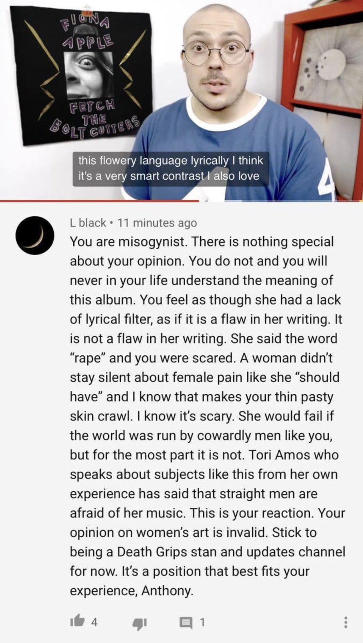 >>129835479Fantano made a joke about Fiona Apple’s rape? What’s next? Having Sam Hyde as a guest?