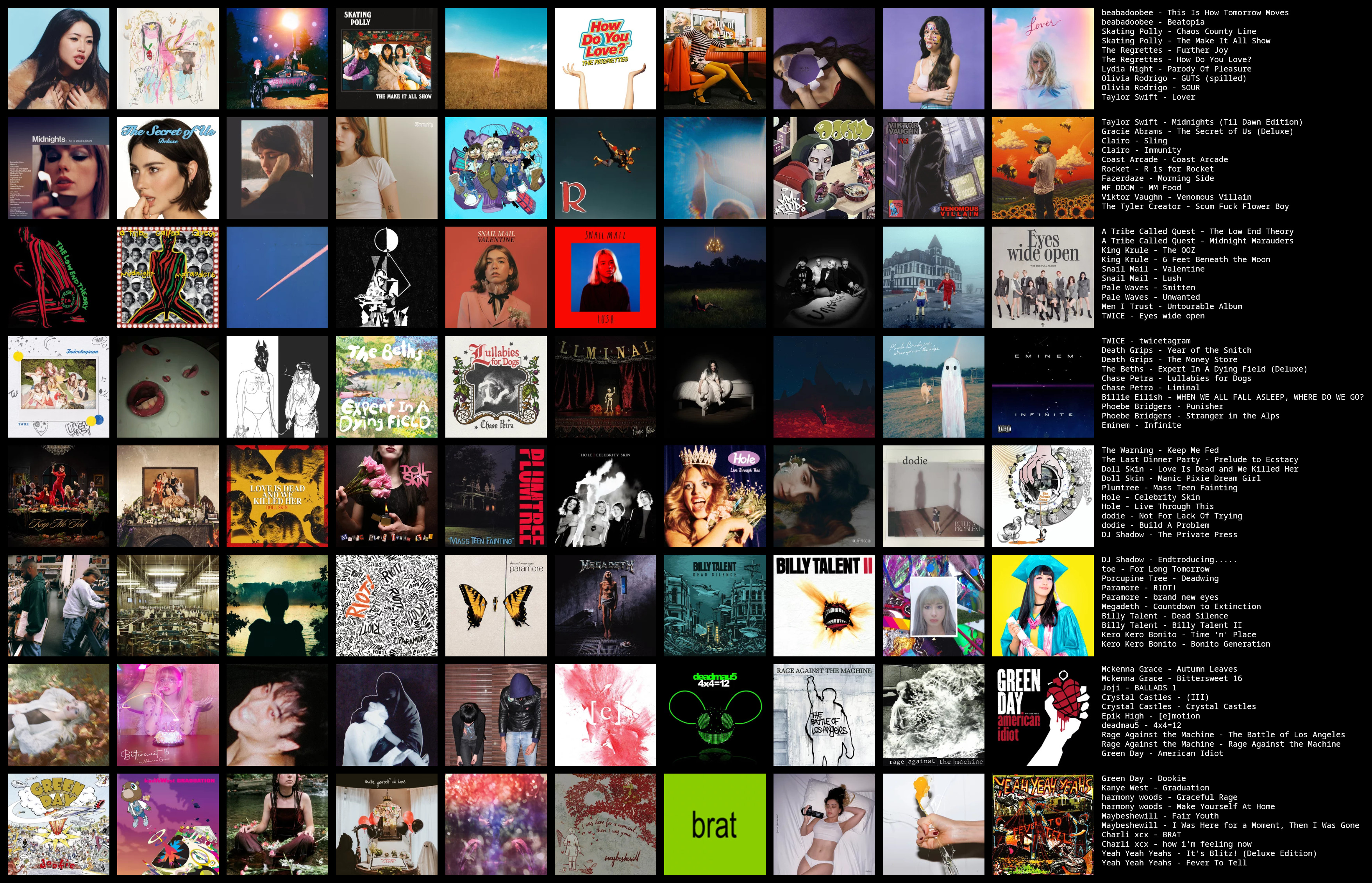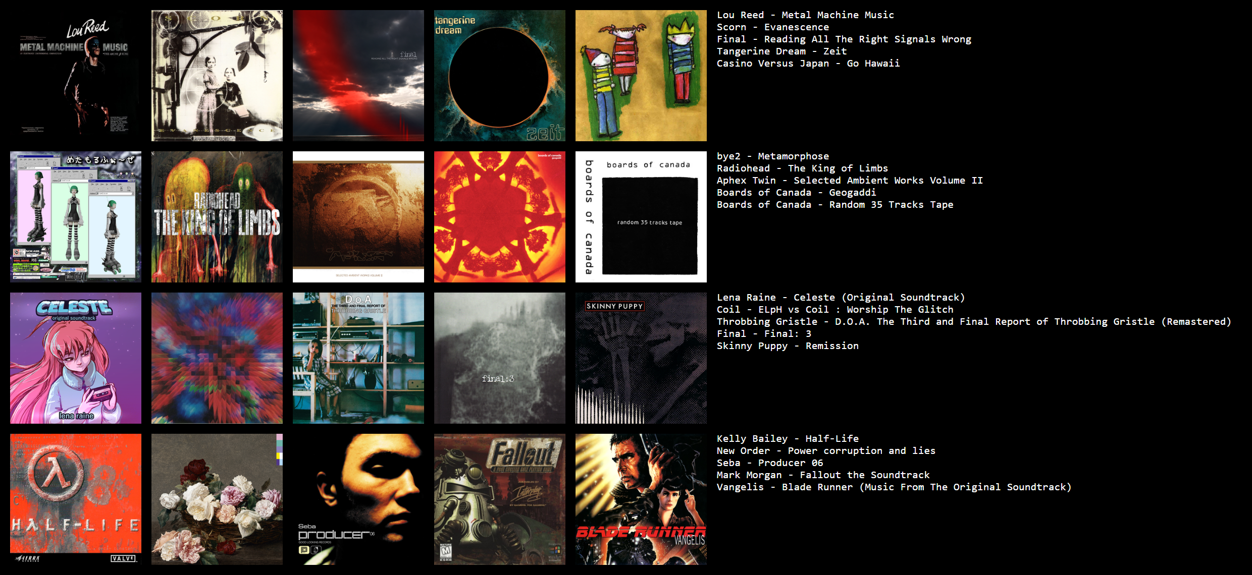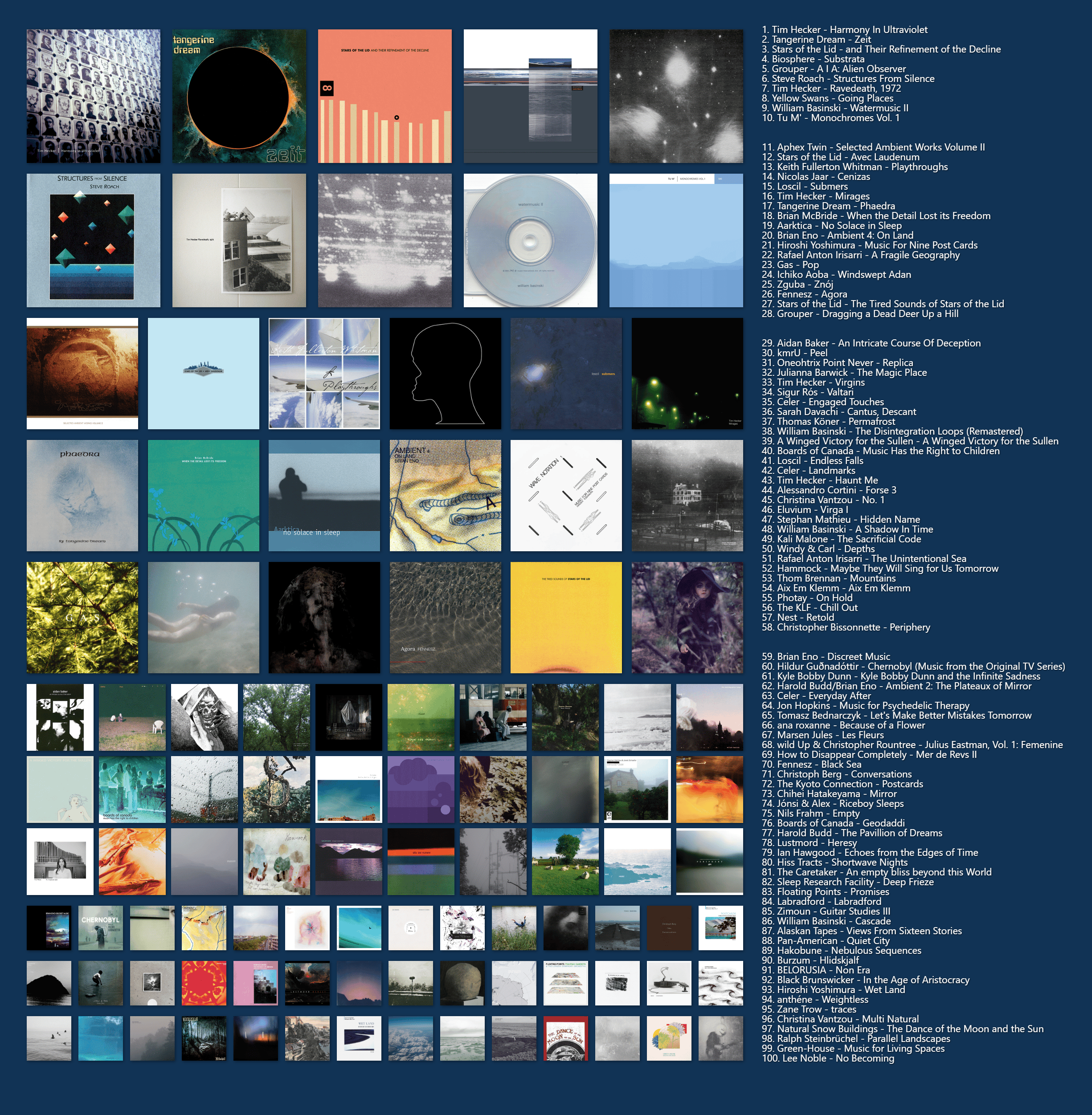 >>129919145It's what I've been listening to lately yea. I legitimately like this stuff.I didn't put any albums on this list that I don't enjoy a tremendous amount, but my all-time list would include more comparatively "normal" artists I'll admit.