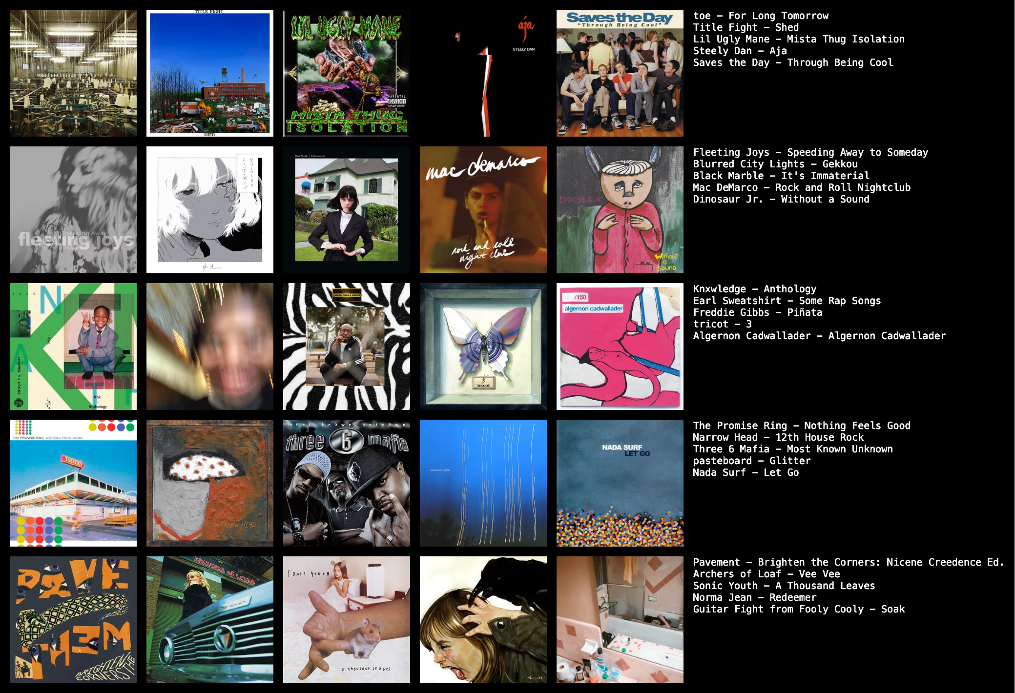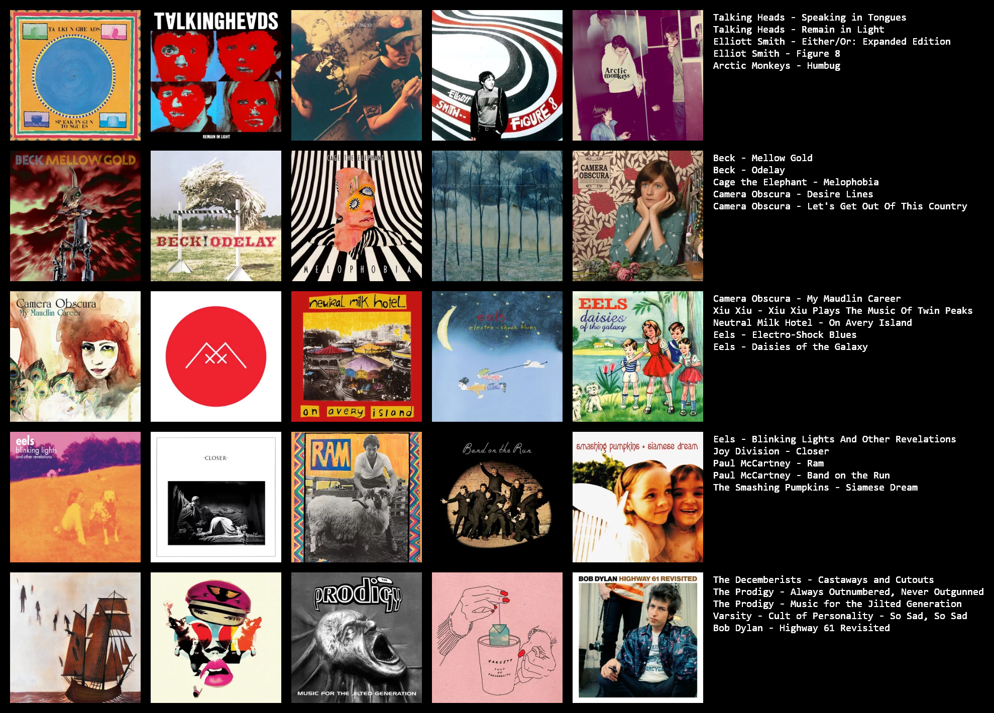 >>129891680Hall of the Mountain Grill, I think (since you like Pink Floyd) https://youtu.be/jvoZochgheA?si=gIi6Dmir3Uk6nCg2 I tried to do something more interesting than just dumping a random chart. My favorite genre is 2000s emo, but I decided to limit my chart to pre-world wide web (<1991) and do a top 20 favorite albums.
