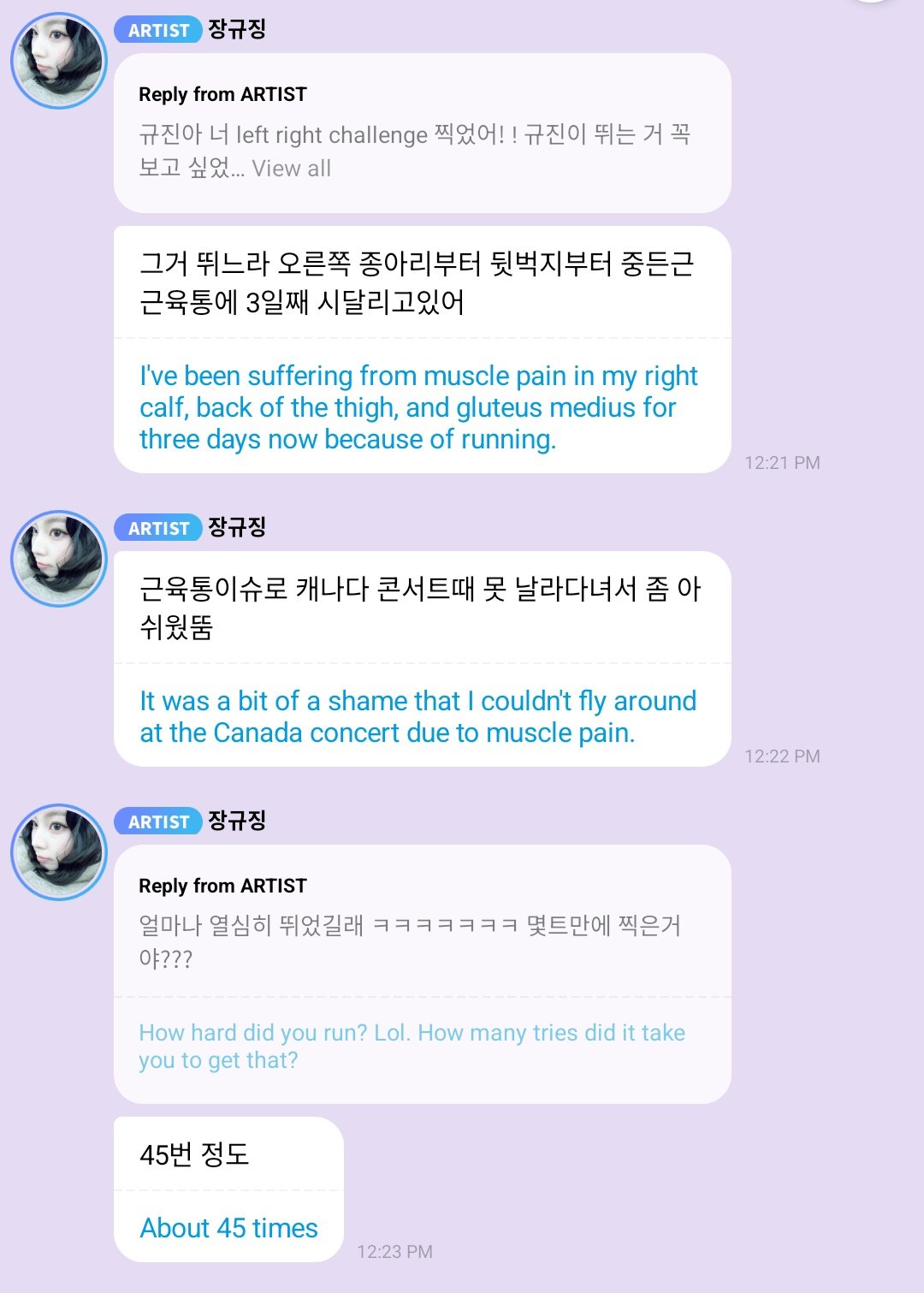 >Kyujin said she filmed the “Left Right” challenge 45 takes, that it left her with muscle pain for 3 days, from her calf to her hamstring and glutes, which affected her performance during the Canada concert...>She explained that even for dancers, doing unfamiliar movements will always cause soreness. Kyujin also admitted the style isn’t really her genre, so she felt a bit awkward and wasn’t fully satisfied with the result, but she still uploaded the best take before she got too drained, and even said her mom helped pick which one to postthese girls go through so much pain, no wonder they retire in their 20s