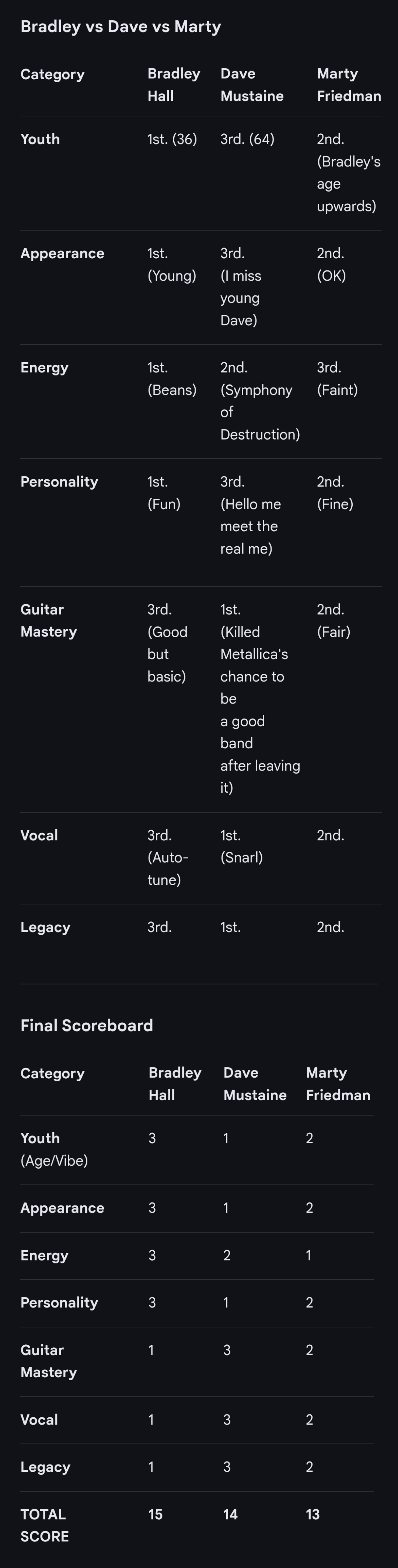 Imagine comparing a legendary Megadeth (trash metal) guitarist to a Twilight Force (power metal) member.