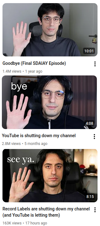 How about youtubers that say IMLEAVINGFOREVAR every couple months?