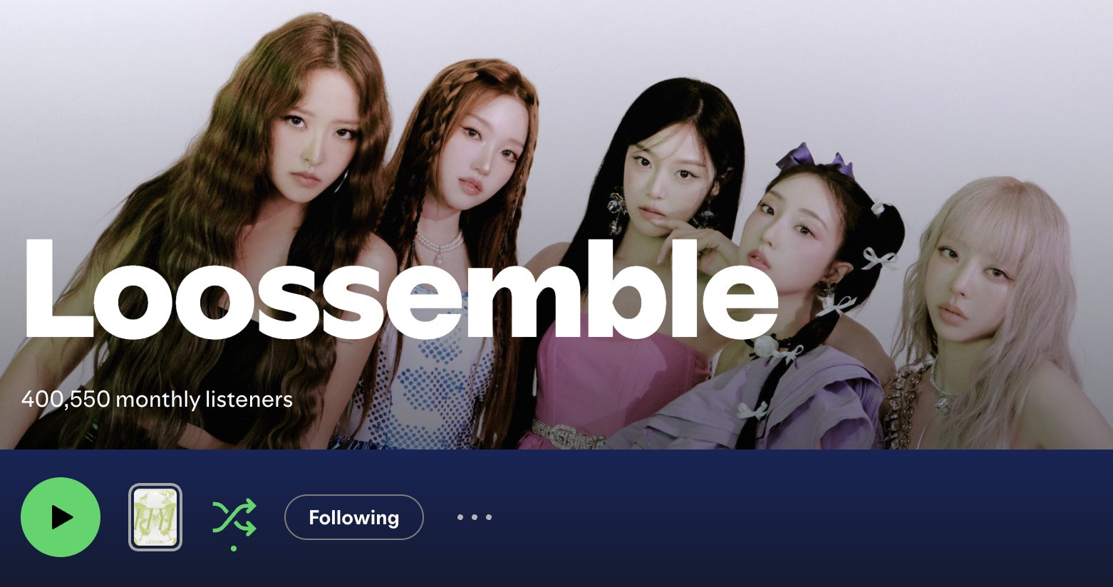Despite not having released a new project or song in 580 days, Loossemble has surpassed 400,000 Spotify monthly listeners.They have been able to consistently maintain around 380-400k monthly listeners on Spotify.