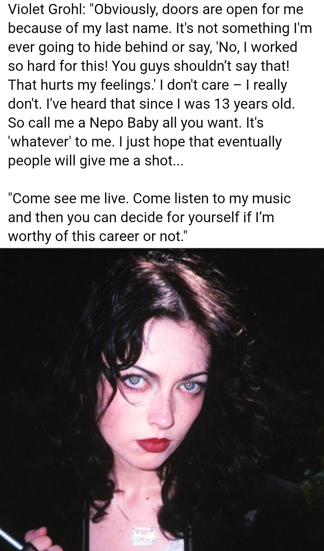 >>129944774Is she playing under the name 'Violet Grohl'? She should've just started a band with a real band name instead. Would probably be less nepotism accusations then.