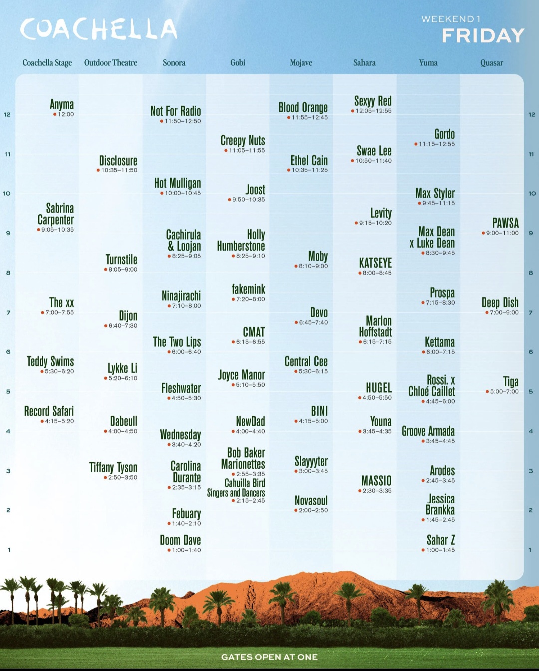 >main5:30 PM - Teddy Swims7:00 PM - The xx9:05 PM - Sabrina Carpenter12:00 AM - Anyma Presents ÆDEN>outdoor4:00 PM - Dabeull5:20 PM - Lykke Li6:40 PM - Dijon8:05 PM - Turnstile10:35 PM - Disclosure11:55 PM - Bonus Set from Do LaB>Sahara4:00 PM - Youna4:50 PM - Hugel6:15 PM - Marlon Hoffstadt8:00 PM - Katseye9:15 PM - Levity10:50 PM - Swae Lee12:05 AM - Sexyy Red>Mojave (usually the best)4:15 PM - Bini5:30 PM - Central Cee6:45 PM - Devo8:10 PM - Moby9:20 PM - Slayyyter10:35 PM - Ethel Cain11:55 PM - Blood Orange>Gobi4:00 PM - Bob Baker Marionettes4:45 PM - NewDad5:30 PM - Joyce Manor6:15 PM - CMAT7:20 PM - Fakemink8:25 PM - Holly Humberstone9:50 PM - Joost11:05 PM - Creepy Nuts>Sonora4:00 PM - Wednesday4:50 PM - Fleshwater6:00 PM - The Two Lips7:10 PM - Ninajirachi8:25 PM - Cachirula & Loojan9:15 PM - Febuary10:00 PM - Hot Mulligan10:55 PM - Carolina Durante11:50 PM - Not for Radio