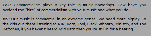>>129968508>I no longer hold this opinion but when I first heard Acid Bath I though who put Creed in my Eyehategod and got dogpiled for thinking this. I have more nuance now but yeah, first impressionsYou're not wrong for thinking that. I dare classify When the Kite Strings Pop as Nu-Metal. Think I'm crazy? Here's Mike Sanchez in his own words.