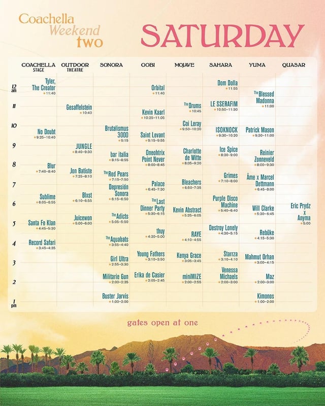 Main Stage:>https://www.youtube.com/watch?v=2NA7XUw51oo4:00pm - Live music returns4:00pm - Tijuana Panthers4:45pm - Wet Leg6:10pm - Major Lazer7:50pm - Young Thug9:55pm - KAROL GOutdoor Theatre:>https://www.youtube.com/watch?v=MdUBm8G41ZU4:00pm - Live music returns4:00pm - Gigi Perez5:15pm - CLIPSE6:45pm - Foster the People8:40pm - Laufey10:30pm - BIGBANGSonora:>https://www.youtube.com/watch?v=OGNPnQViI3g4:00pm - Live music returns4:00pm - Model/Actriz4:45pm - Jane Remover5:30pm - Los Retros6:40pm - RØZ8:00pm - DRAIN9:10pm - French Police10:15pm - GlittererGobi:>https://www.youtube.com/watch?v=4C5p1tdRv6c4:00pm - Live music returns4:05pm - COBRAH5:15pm - Oklou6:30pm - Black Flag7:10pm - flowerovlove7:45pm - TOMORA9:05pm - The Rapture10:00pm - The ChatsMojave:>https://www.youtube.com/watch?v=HJVG2Ck3uuk4:00pm - Live music returns4:25pm - Little Simz5:35pm - Suicidal Tendencies6:30pm - Samia7:10pm - Iggy Pop8:45pm - FKA twigsSahara:>https://www.youtube.com/watch?v=NlrpPqb0vwo4:00pm - Live music returns4:00pm - Girl Math (VNSSA x NALA)5:05pm - BUNT.6:10pm - Duke Dumont7:25pm - Mochakk9:05pm - Subtronics10:45pm - KaskadeQuasar:>https://www.youtube.com/watch?v=1KANGsDaRvw4:00pm - Live music returns4:00pm - Jazzy6:00pm - JOY (Anonymous)8:00pm - Fatboy Slim
