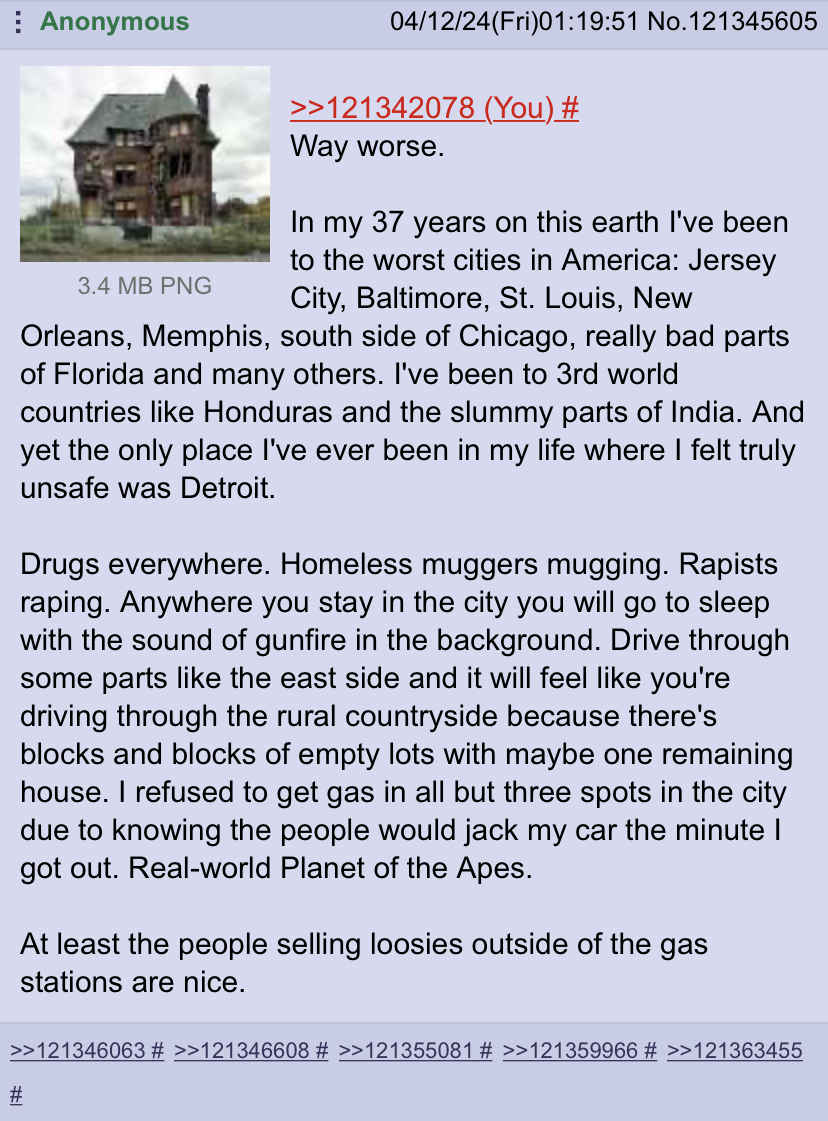 >>130005687I don't like ICP. But I have lived in Detroit. Not the nice parts. This person is larping. But that's what makes Detroit so wonderful. It's one of the places where the cowardly and pathetic will not tread. I do my thing there and nothing ever happens. But people just hear the name of the city and their imaginations run wild. It's not like bad things didn't happen around me either. But they didn't happen to me. I did not create situations that provoked those kinds of things. If someone did pull some shit unprovoked that's what the gun is for. That's the other good thing about Detroit. Someone coming around to fuck with you either has to be on crack or ready to shoot first if they're going to try to start some shit. Everyone knows you're probably packing and assumes so even if you aren't. So they just leave you alone.