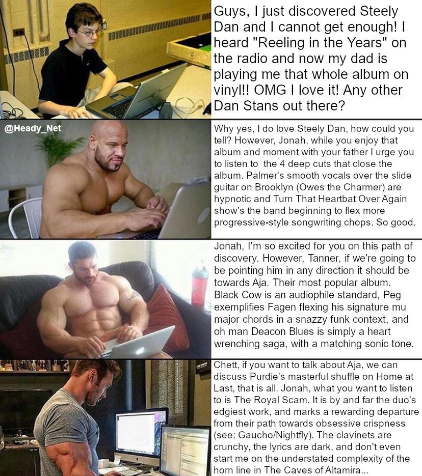 >>130007921>We’d be remiss if we didn’t include this anecdote about seasoned studio engineer Lenise Bent, who worked with the band during their Aja sessions. It was the recording of the song “Home at Last” that brought her to a breaking point, due to Fagen and Becker’s insistence on getting two words, two syllables, absolutely perfect. As remembered by Dick LaPalm, Bent’s friend and publicist extraordinaire:>‘Dick, I have to talk to you.’ She put her head down on the desk in her arms and said, ‘Well-the, well-the, well-the.’ I said, ‘What are you doing?’ Lenise looked up and said, ‘Dick, I have to get off the Aja session. They worked on the words ‘well the’ for six hours last night. All they did was work those two words for just the right sound for hours. I really have to get off the session.’You misspelled "kino" by the way