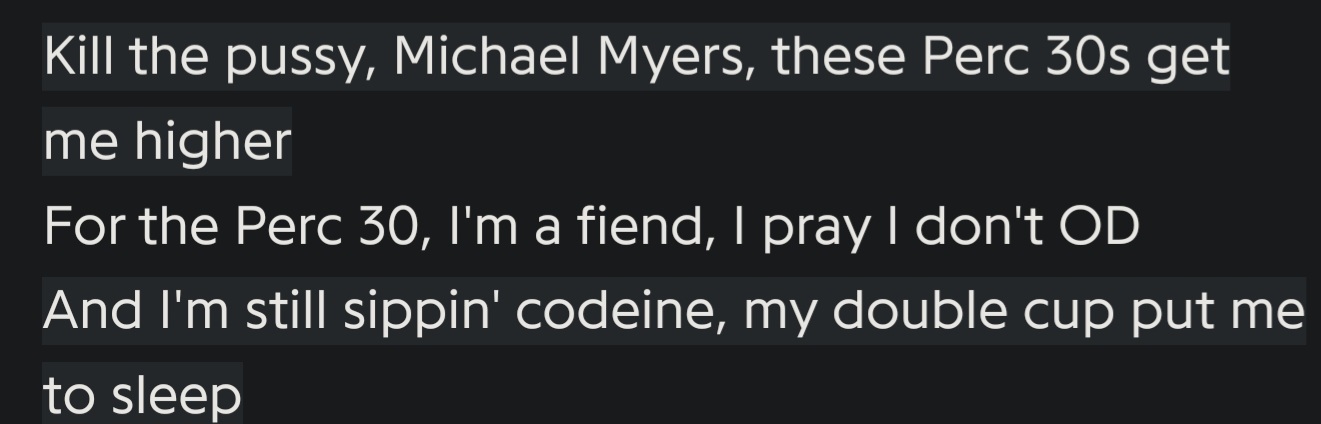 AND THAT ONE TIME THAT YOU LEFT ME I TOOK 10 PERCS TO GET HIGH10 PERCS TO GET HIGHPRAY THAT I DON'T DIEBUT IF I DIESEE YOU IN THE SKYTWO PINTS OF THE QUA-QUA DON'T LEAVE JUST STAY BAELETS GO ON A VACAYLEAVE THE WORLD BEHIND