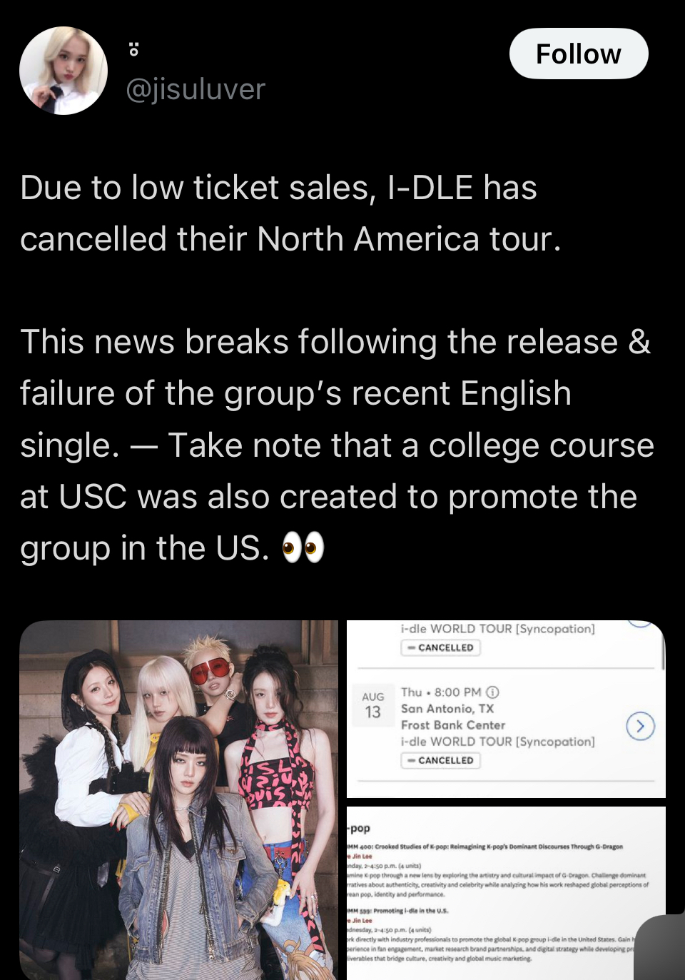 rumors are that i-dle's tour didn't get cancelled because of low sales but because their tour operator got sued... my friend was really excited about going