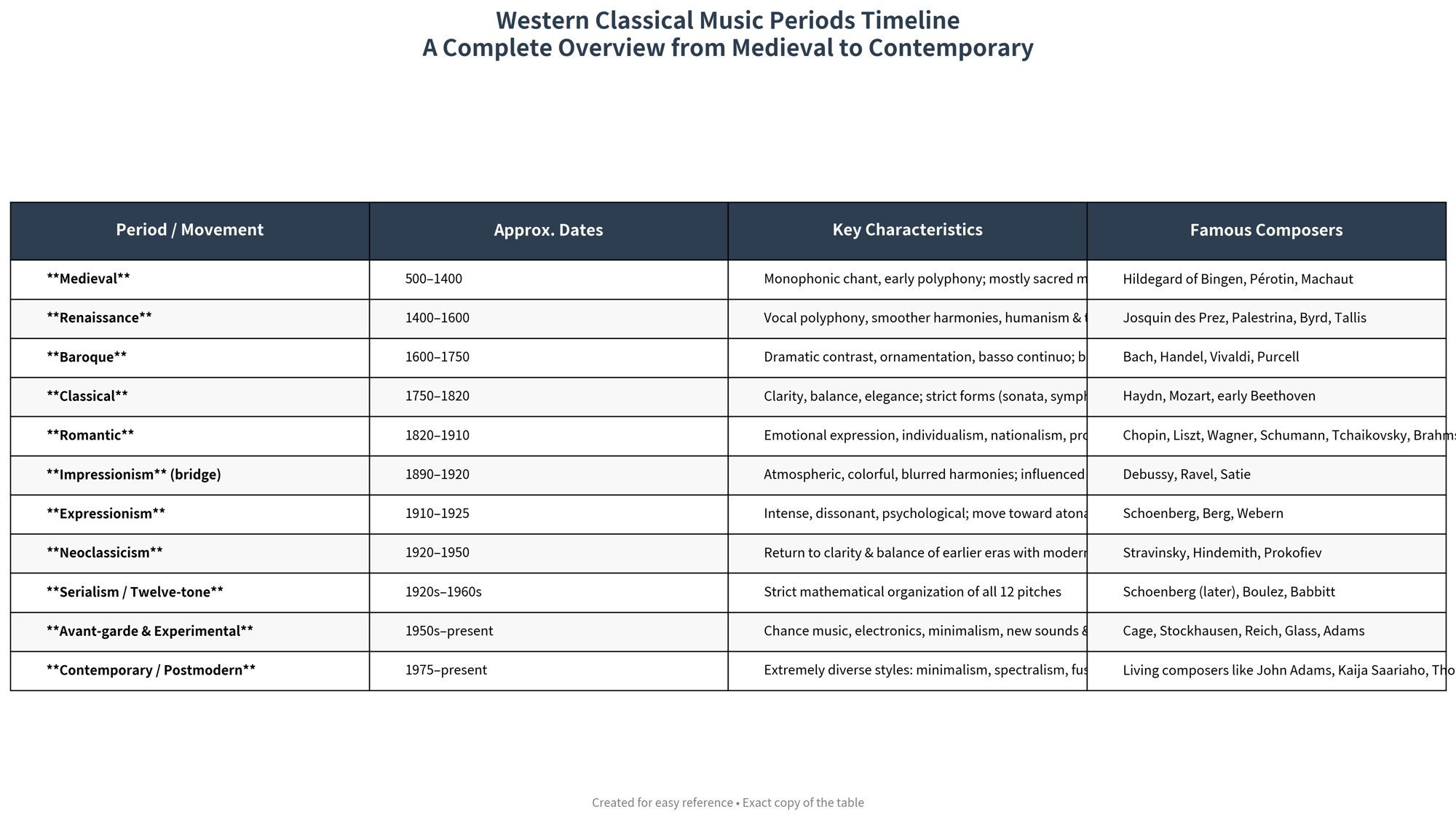>>130020334You either show the internal diversity of all periods, including Medieval and Renaissance, or you don't. Flattening 900 years into two boxes while singling out things like Impressionism as a "bridge" (a bridge to what?) is stupid, especially when actual transitional styles like galant/Empfindsamkeit are left out.Then most of the 20th century gets arbitrarily split into overlapping labels, even though it could just as easily be grouped under Modernism. And those aren't even the same kind of categories. Some are stylistic, some technical, some just vague umbrellas. So it can't decide whether it's using broad periods or fine-grained styles, and ends up doing both badly. It's incoherent.