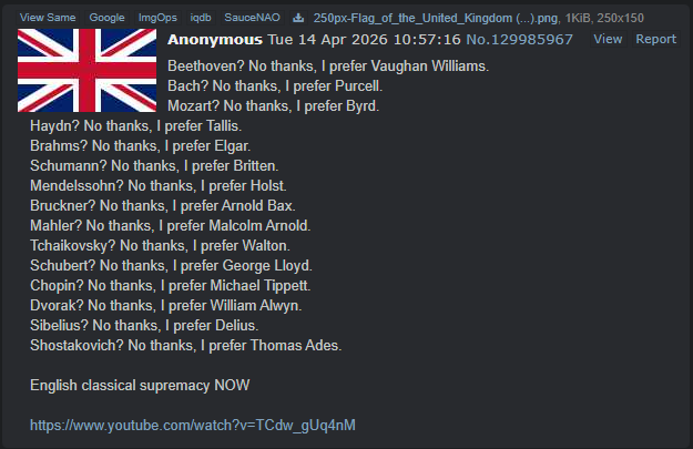 >>130035621That's okay, plenty of variety in tastes here in /classical/ :)Although it does make for some lame afternoons where everyone wants to discuss something different that no one else online is into, so it's all posts with no replies, lol.