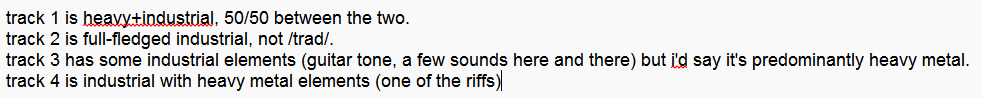 >>130032057there's a few songs that are groove metal, but overall most of its industrial. there's a lot of sounds and riffs throughout many of the songs that try and emulate the sound of metal clanking together, a lot of bouncy, chugging riffing; and some of them just outright eschew traditional metal and rock structure altogether. (e.g. mysterons, northern wisdom)
