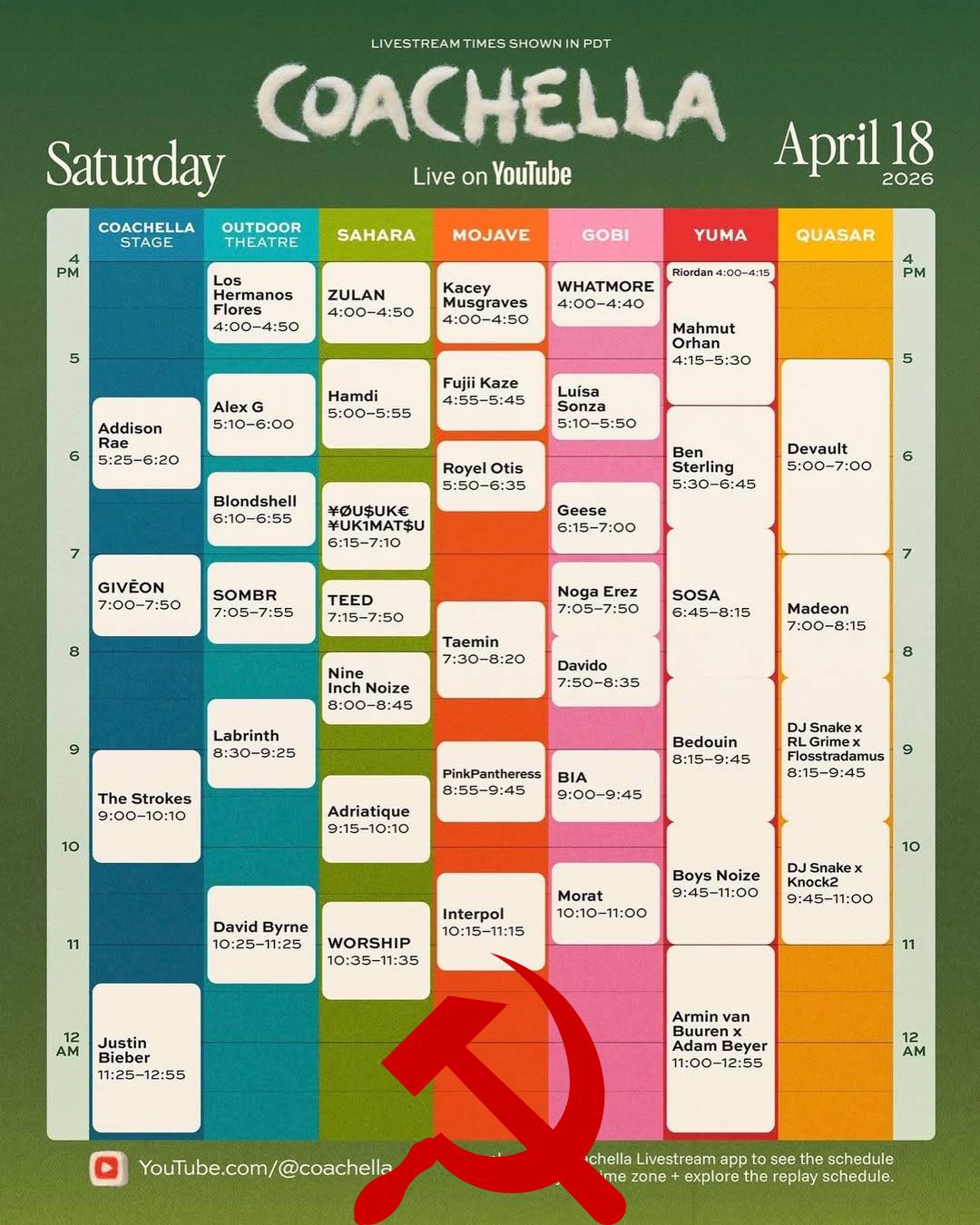 Day Two of Week 2 Edition part 3>main5:25 PM - Addison Rae7:00 PM - GIVĒON9:00 PM - The Strokes11:25 PM - Justin Bieberhttps://www.youtube.com/watch?v=xIiSaqq10Yw >outdoor4:00 PM - Los Hermanos Flores5:10 PM - Alex G6:10 PM - Blondshell7:05 PM - SOMBR8:30 PM - Labrinth10:25 PM - David Byrnehttps://www.youtube.com/watch?v=CzAJcgiywFo >sahara4:00 PM - ZULAN5:00 PM - Hamdi6:15 PM - ¥ØU$UK€ ¥UK1MAT$U7:15 PM - TEED8:00 PM - Nine Inch Noize9:15 PM - Adriatique10:35 PM - WORSHIPhttps://www.youtube.com/watch?v=bkCTPTwU7ls >mojave4:00 PM - Kacey Musgraves4:55 PM - Fujii Kaze5:50 PM - Royel Otis7:30 PM - Taemin8:55 PM - PinkPantheress10:15 PM - Interpolhttps://www.youtube.com/watch?v=cYT79Dp0Wuk >gobi4:00 PM - WHATMORE5:10 PM - Luísa Sonza6:15 PM - Geese7:05 PM - Noga Erez7:50 PM - Davido9:00 PM - BIA10:10 PM - Morathttps://www.youtube.com/watch?v=OMImphySFJs >yuma4:15 PM - Mahmut Orhan5:30 PM - Ben Sterling6:45 PM - SOSA8:15 PM - Bedouin9:45 PM - Boys Noize11:00 PM - Armin Van Buuren x Adam Beyerhttps://www.youtube.com/watch?v=s5A5Y93nmPI >quasar5:00 PM - Devault7:00 PM - Madeon8:15 PM - DJ Snake x RL Grime x Flosstradamus9:45 PM - DJ Snake x Knock2https://www.youtube.com/watch?v=iulgXa5S62A