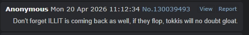 >>130045677sounds more like tokkis are the parasites if they can't let anybody talk about illit without bringing up their dead group