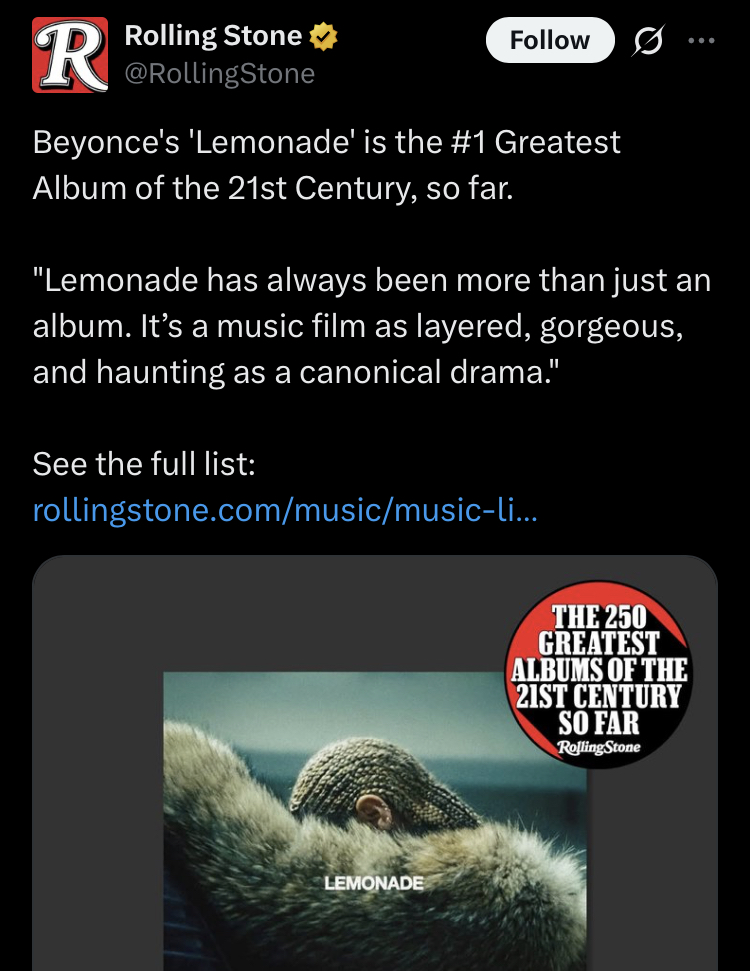 >>130074296Beyonce has been insanely boring and forgettable as a solo artist and the endless shilling is not helping.