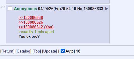 >>130086538>>130086526>>130086512>exactly 1 min apartYou ok bro?