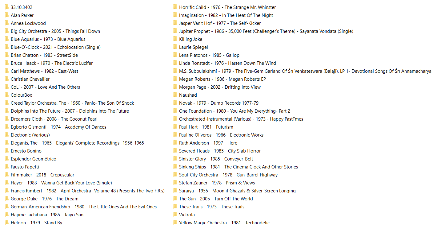 >>130102882continuedElectronic (Various) 2015 CommonThread's Knives Replace Air- Volume 1Elegants, The 1965 Elegants' Complete Recordings- 1956-1965Ernesto Bonino 1941 Time No Longer Passes - Since I've Been Thinking Of You (Single)Ernesto Bonino 1946 The Great Voices Of Italian SongEsplendor Geométrico 2013 UltraphoonEsplendor Geométrico 2013 Ultraphoon- Physical Edition EPFausto Papetti 1964 5th CollectionFausto Papetti 1966 I Remember No. 3Fausto Papetti 1967 A Man And A Woman - Misty (Single)Filmmaker 2018 CrepuscularFlayer 1983 Wanna Get Back Your Love (Single)Francis Rimbert 1982 April Orchestra- Volume 48 (Presents The Two F.R.s)George Duke 1976 The DreamGerman-American Friendship 1980 The Little Ones And The Evil OnesGrace Jones - 1985 - Slave To The RhythmHajime Tachibana 1985 Taiyo SunHeldon 1979 Stand ByHorrific Child 1976 The Strange Mr. WhinsterImagination 1982 In The Heat Of The NightJasper Van't Hof 1977 The Self-KickerJohanna Beyer - 1943 - Sticky MelodiesJupiter Prophet 1986 35,000 Feet (Challenger's Theme) - Sayanata Vondata (Single)Killing Joke 1981 Unspeakable (Demo)Killing Joke 1981 What's This For . . . !Laurie Spiegel 1980 The Expanding UniverseLaurie Spiegel 1980 The Expanding Universe- Reissued EditionLaurie Spiegel 1983 Obsolete SystemsLena Platonos 1985 GallopM.S. Subbulakshmi 1979 The Five-Gem Garland Of Sri Venkateswara (Balaji), LP 1- Devotional Songs Of Sri AnnamacharyaMegan Roberts 1986 Megan Roberts EPMorgan Page 2002 Drifting Into ViewNaushad 1943 The Law (Soundtrack)Naushad 1982 The Magic Of NaushadNovak 1979 Dumb Records 1977-79One Foundation 1980 You Are My Everything- Part 2Orchestrated-Instrumental (Various) 1973 Happy PastTmesPaul Hart 1981 FuturismPauline Oliveros 1966 Electronic WorksRuth Anderson 1997 Here