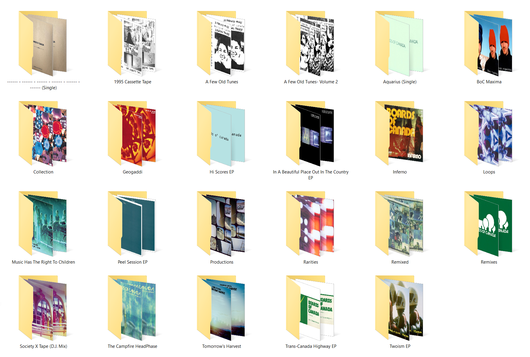 Also, here is every released BoC album, single, EP, comp appearance, remix, in a very tidy and compact collection, including stuff like the Wouldn't You Like To Be Free snippet, all meticulously sourced from Log'd FLACs or Qobuz.https://mega.nz/folder/N0FnjAQR#-vxP-eyFCbT9XXWY_zETmAlike for the aquarius single that is sourced from the actual files before being pressed to recordthis one is all MP3, but LAME 3.100 encoded, extremely high quality, indistinguishable from lossless