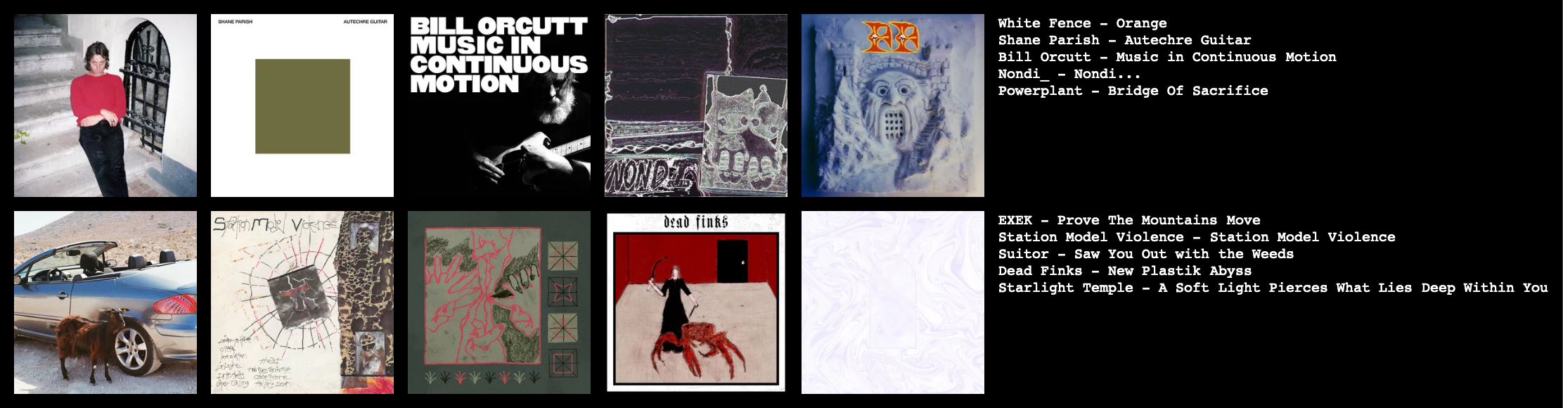 >>130112509I did, and I'm glad. White Fence, Shane Parish, and EXEK all sounded pretty good or at least promising. I'd already heard that Nondi album. Thanks for sharing the chart.