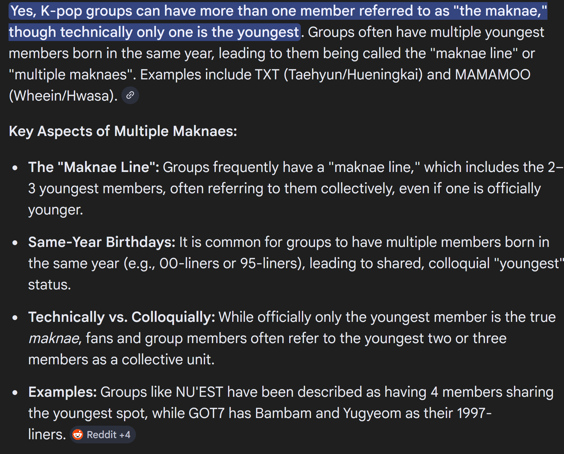 >>130104497Yes because you ask maknae and not maknaes lmao ask anyone who the maknaes of twice are and you'll get 3 people because It's pluralized you fucking tard