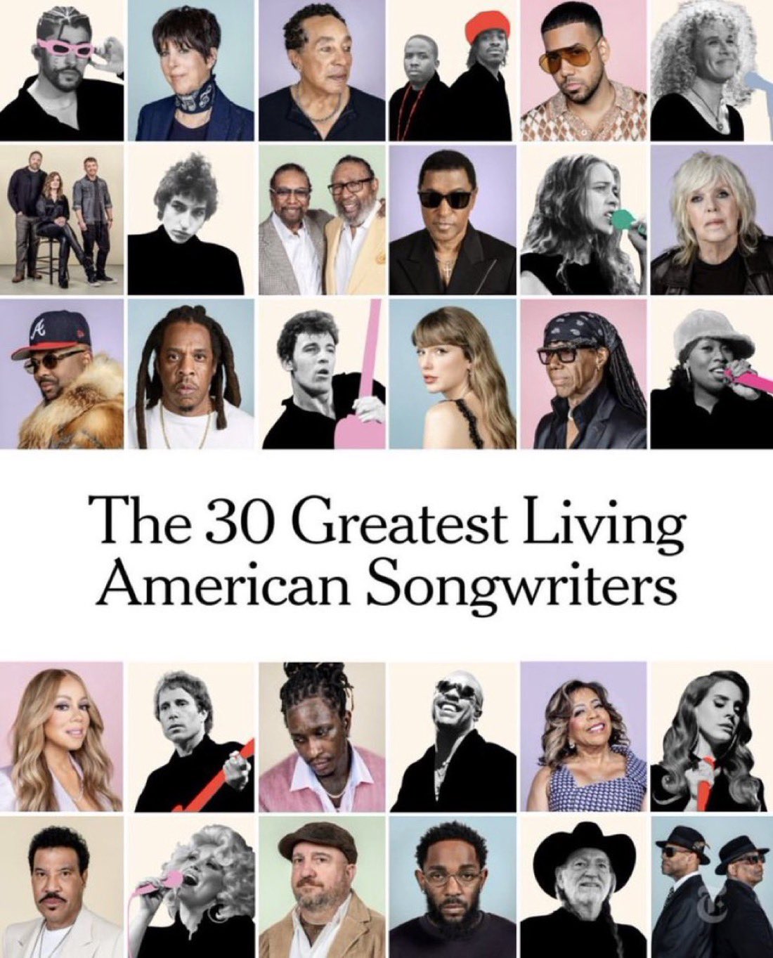https://www.nytimes.com/interactive/2026/magazine/greatest-american-songwriters-alive.htmlJay-ZYoung ThugKendrick LamarOutKastMissy ElliottMariah CareyThe-DreamBad BunnyBabyfaceStevie WonderNile RodgersJimmy Jam & Terry LewisSmokey RobinsonLionel RichieTaylor SwiftLana Del ReyDolly PartonBob DylanBruce SpringsteenPaul SimonCarole KingWillie NelsonMike LoveFiona AppleLucinda WilliamsRomeo SantosValerie SimpsonBrian & Eddie HollandStephin MerrittJosh Osborne, Brandy Clark & Shane McAnally