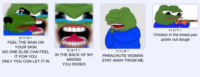 >>130140484These threads puzzle me, its almost always some low quality comment or just yelling random song lyrics. Is it one schizo making these threads or is it some unwritten rule to shitpost with a pepe picture.