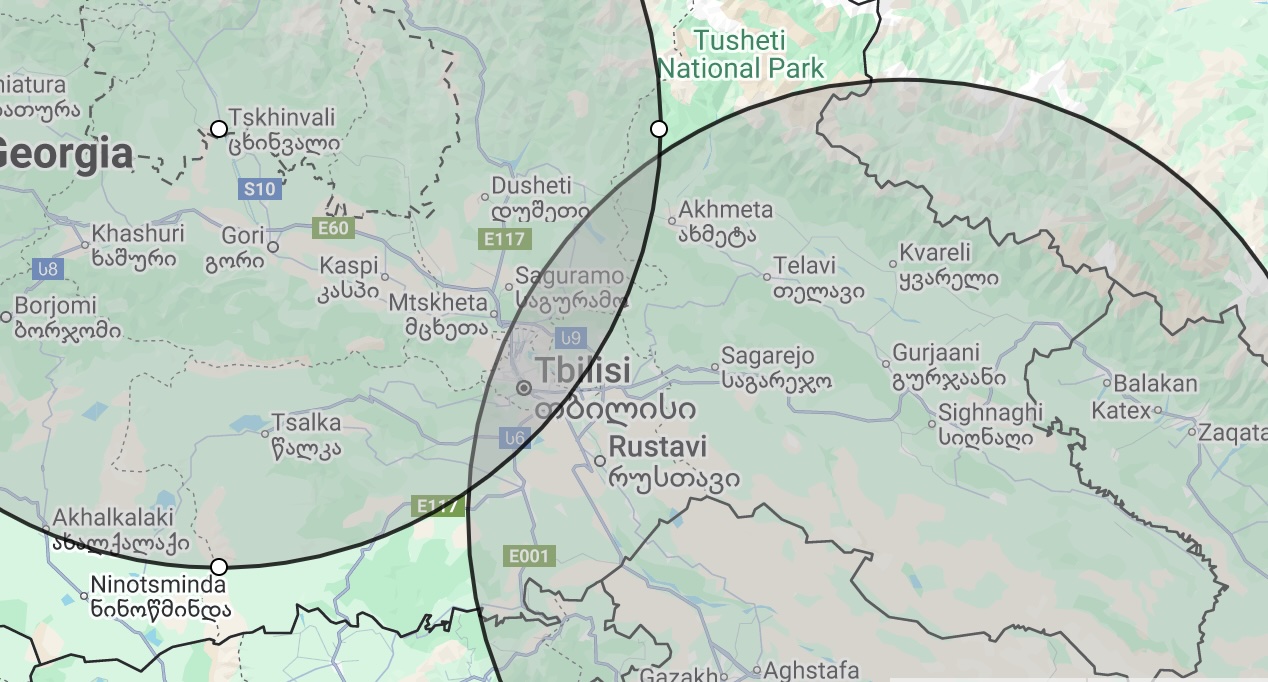 Actually I forgot about South Ossetia which is effectively Russian territory from a military point of view. Here's 100km from Tskhinvali, an alleged site for S-300. As you can see this doesn't work terribly well either. They would have to shoot the missile over Georgia's capital which would be hard to do discreetly.