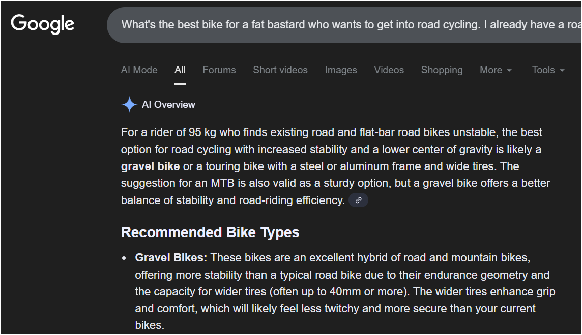 >>2061105I think I might be the "shiczo" you're referring to because you've replied to my posts like this in the past. I think it's just "everyone who writes more than 3 words at a time is a schizo"t. exclusive roadie with only 700c tires ever so that clearly isn't me