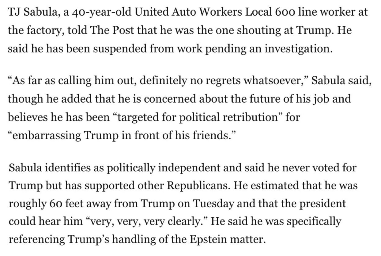 Anonymous 01/14/26(Wed)18:54:24 No. 1477660 >>1477599 I have no doubt that Democrat cities will be continuing to do that just fine with their ocean of homeless drug addicts without the federal government enabling fraud from the non profits who keep the funding while minimally helping the problem Anonymous Pedophile say 'fuck you' and f(...) 01/13/26(Tue)19:37:01 No. 1477177 https://thehill.com/homenews/administration/5687687-ford-worker-trump-incident/ President Donald Trump appeared to flip off a person heard calling him a “pedophile protector” during his visit to Michigan on Tuesday. Video obtained by TMZ shows the president at the Ford plant. He appears to point at the accuser as he says, “f*** you,” then gives the person the middle finger as he walks away. The president was touring Ford’s River Rouge complex in Dearborn, Michigan Tuesday afternoon before delivering a speech at the Detroit Economic Club. The accusation against Trump came after the president pushed back on the release of the Epstein files for months last year, despite saying on the campaign trail he would release the files if reelected. Trump had been a close associate of the convicted sex offender, and his pushback on releasing the files sparked widespread outrage, even from some of his MAGA supporters, and raised further questions about the president’s own relationship with the disgraced financier, who died in jail in 2019. After months of delays, a bipartisan group of lawmakers last fall was able to buck GOP leadership and force a vote for the Justice Department to release the full Epstein files. As the bill appeared poised to pass with overwhelming support, the president reversed course and backed it. Comment too long. Click here to view the full text. 52 replies omitted. Click here to view. >>