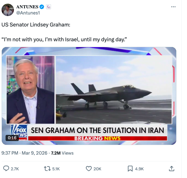 Anonymous Lindsey Graham Draws MAGA Ange(...) 03/12/26(Thu)15:42:56 No. 1496621 https://www.newsweek.com/lindsey-graham-draws-maga-anger-over-israel-comments-11651141 South Carolina Senator Lindsey Graham has sparked fierce backlash from big MAGA names after he professed his loyalty to Israel and said he was asking Americans to send their sons and daughters to the war in the Middle East. "To all the antisemites, to all the isolationists…I’m not with you, I’m with Israel, I will be with Israel to our dying day," he said in a Fox News interview. Later, while condemning what he called "double-dealing in the Arab world," he said: "I’m going back to South Carolina, I’m asking them to send their sons and daughters into the Mid East." Several MAGA supporters have spoken out against Graham and his comments, and others he has made recently, with one calling him "traitorous" and conservative podcaster Megyn Kelly calling him a "homicidal maniac." 106 replies omitted. Click here to view. >>