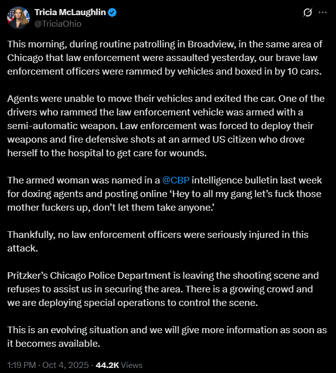 > Thread theme: https://www.youtube.com/watch?v=hSVqj0izi2chttps://nypost.com/2025/10/04/us-news/us-border-patrol-agents-shoot-woman-in-chicago-after-they-were-boxed-in-by-cars/> U.S. Border Patrol agents shot an armed woman in Chicago Saturday after an angry mob tried to attack the law enforcement officers.> The group of agents were conducting their routine patrol near 39th Place and South Kedzie Avenue in the city’s South Side “when they were attacked and rammed by vehicles and boxed in by 10 cars,” the Department of Homeland Security said.> “The officers exited their trapped vehicle, when a suspect tried to run them over, forcing the officers to fire defensively,” according to DHS, which called the incident “an evolving situation” and noted FBI agents were currently on the scene. > The suspect, who is a U.S. citizen, was armed with a semi-automatic weapon, department spokeswoman Tricia McLaughlin said.> The gun-toting woman was already known to the federal agency for allegedly publicly identifying agents and encouraging people to attack them, according to McLaughlin.> “The armed woman was named in a CBP intelligence bulletin last week for doxing agents and posting online ‘Hey to all my gang let’s f–k those mother f–kers up, don’t let them take anyone,’” McLaughlin wrote on X.> More federal agents were set to be deployed because of the incident, Homeland Security Secretary Kristi Noem wrote on X.> “Today in Chicago, members of our brave law enforcement were attacked—rammed and boxed in by ten vehicles, including an attacker with a semi-automatic weapon.I am deploying more special operations to control the scene. Reinforcements are on their way,” she wrote.> “If you see a law enforcement officer today, thank them,” Noem added.