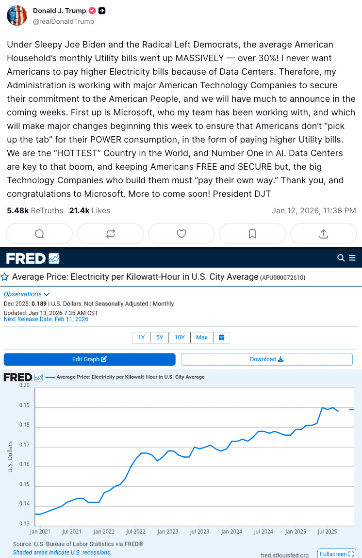 Anonymous 01/13/26(Tue)23:31:20 No. 1477259 >>1477194 >Trump steps up to shield Americans from Bidens disastrous energy policy This has nothing to do with whatever you're talking about and everything to do with AI data centers driving up power bills. And Trump has been championing, pushing, and deregulating AI like crazy. This is a step in the right direction, but you'll forgive me if I don't buy it helping much.>The Luddite left is left seething and malding. And I don't even know what you're trying to say there. The luddite left is mad that AI, which they hate, will have a harder time powering their data centers, which they also hate?>>