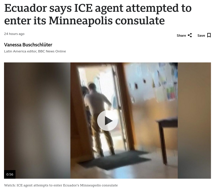 Anonymous Nation of Ecuador says ICE tri(...) 01/29/26(Thu)06:24:03 No. 1484987 https://www.bbc.com/news/articles/c4g40k40xndo The government of Ecuador has condemned what it described as an attempt by a US federal immigration agent to enter the Ecuadorean consulate in Minneapolis. The agent was prevented from gaining access by consular officials, who acted "to guarantee the protection of the Ecuadoreans who were inside the consulate at the time", a statement by Ecuador's foreign ministry said. Ecuador, whose president is an ally of Trump, has filed an official complaint. The incident comes at a time of high tension in the US city, just days after intensive care nurse Alex Pretti was shot dead by border agents during protests against the Trump administration's immigration crackdown in Minneapolis. Ecuador's foreign ministry said in a statement that an agent of the US Immigration and Customs Enforcement agency (ICE) had "tried to enter the premises of the consulate" at 11:00 local time (17:00 GMT) on Tuesday. Under the 1963 Vienna Convention on Consular Relations, consular premises are considered "inviolable". According to the Convention, the authorities of the country where the consulate is located "shall not enter" the parts of the consulate used for work "except with the consent of the head of the consular post". Ecuador said that its officials had not consented to ICE entering the consulate. While the Vienna Convention goes on to say that consent may be assumed in certain cases, they are limited to incidents where "prompt protective action" is required, such as in the case of a fire or some other disaster. In a video shared by Ecuadorean media, which has not been independently verified by the BBC, a consular official can be seen rushing to the entrance door and telling an ICE agent "this is the consulate, you're not allowed in here". The agent tells the official that "if you touch me, I will grab you". >>
