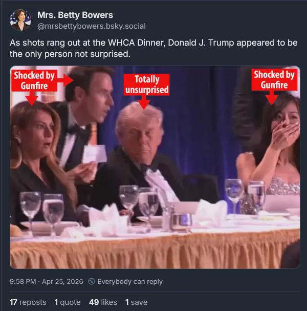 Anonymous 04/26/26(Sun)15:00:58 No. 1509415 >>1509411 Who the fuck says "Shots fired" in that context? Also:>This happened at the only time Trump has been at the dinner in years >Trump's completely unphased >They didn't even cancel it afterwards >Every fucking Right-wing influencer got a "This is why we need the ballroom!" marching order right after >>